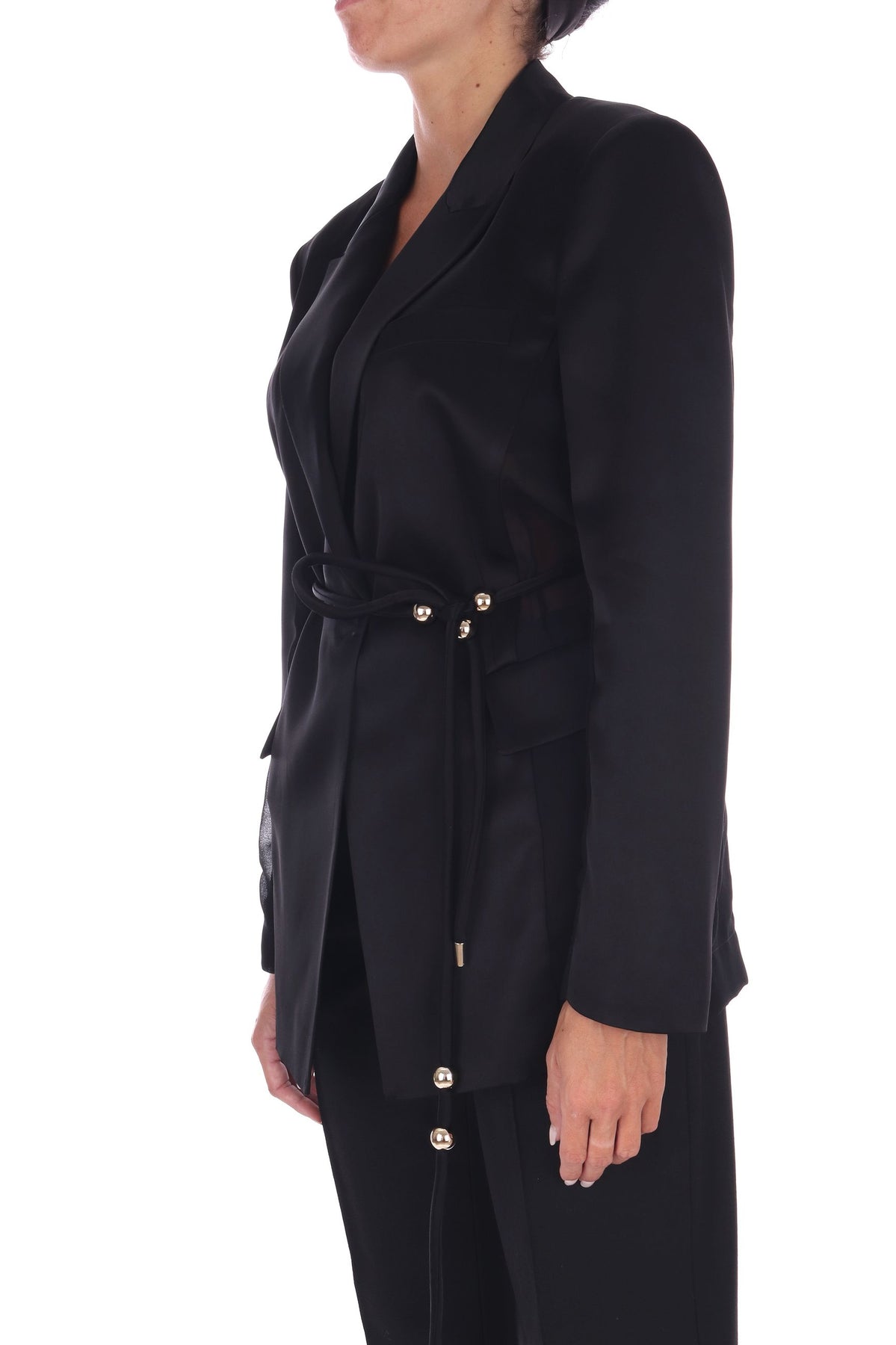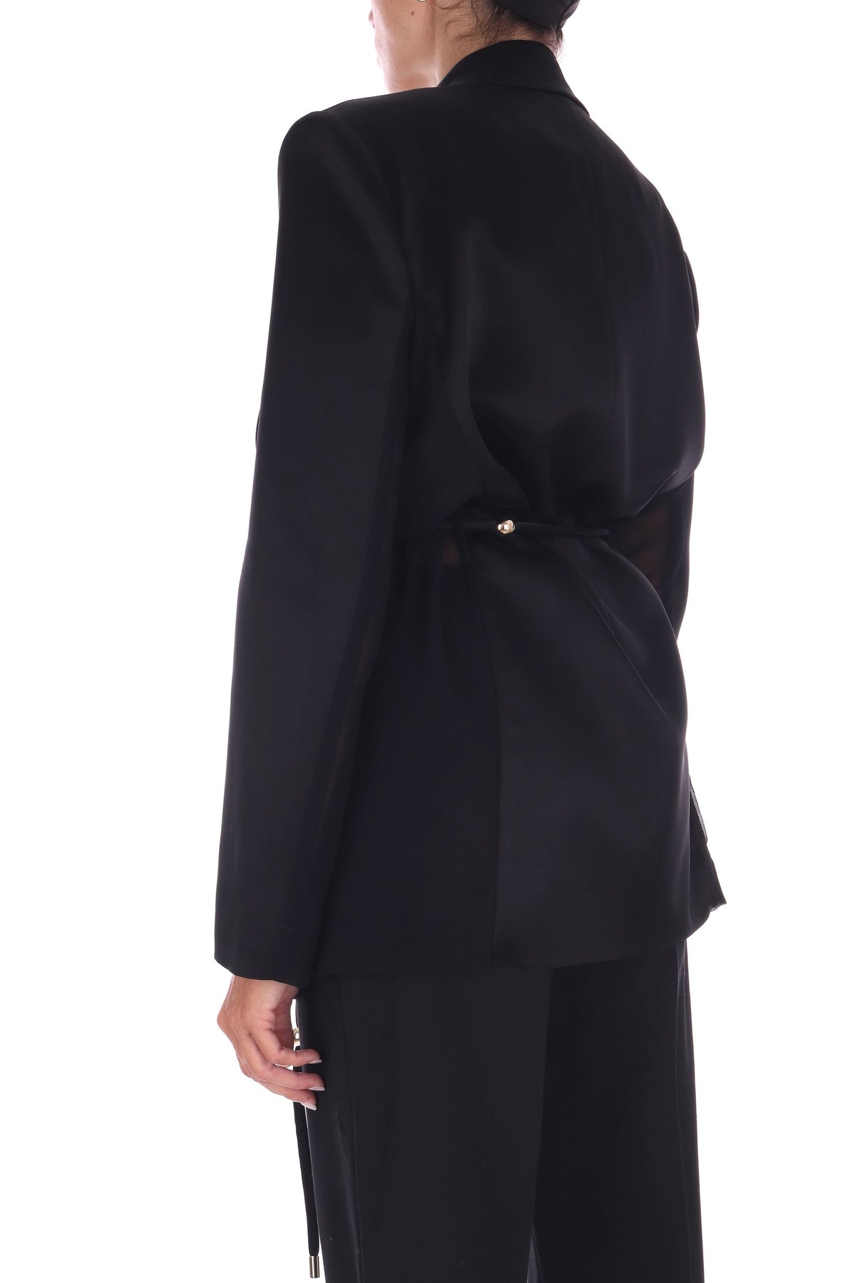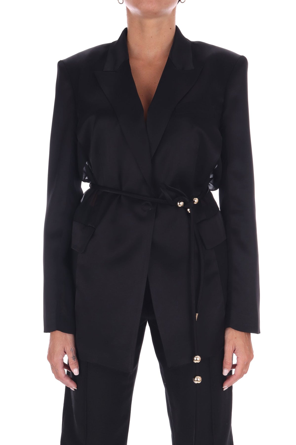Blazer sfiancato unisce eleganza e modernità con dettagli raffinati. Le tasche frontali e la cintura in stile trekking con boule di metallo definiscono la vita, mentre le trasparenze su corpo e maniche aggiungono un tocco di sensualità discreta. Il raso lucido dona una brillantezza unica e una morbidezza al tatto, rendendo il capo perfetto per dare risalto a ogni outfit da occasione speciale. Un must-have essenziale per chi desidera distinguersi con stile.
