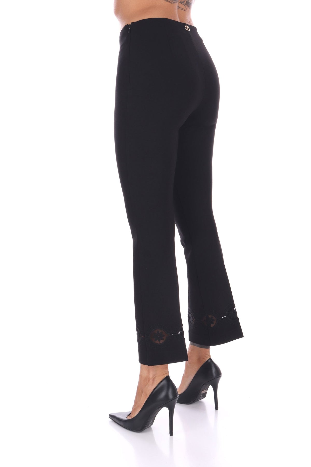Pantaloni in punto Milano con una linea a sigaretta chic e lunghezza alla caviglia, perfetti per chi ama un look fresco e raffinato. La chiusura con zip invisibile al fianco assicura un fitting impeccabile, mentre la piega stirata aggiunge quel tocco elegante. Il dettaglio speciale? Un ricamo floreale traforato sul fondo, che porta un pizzico di allegria e originalità a ogni passo!