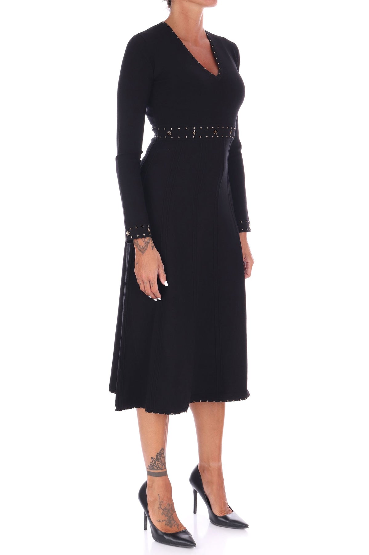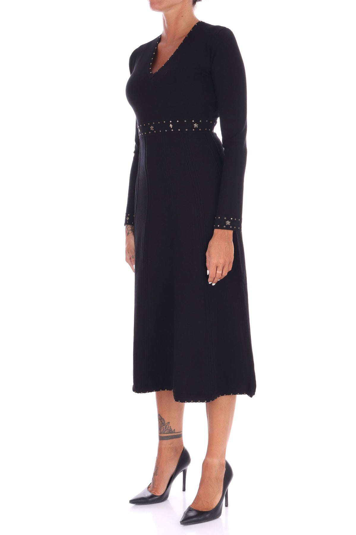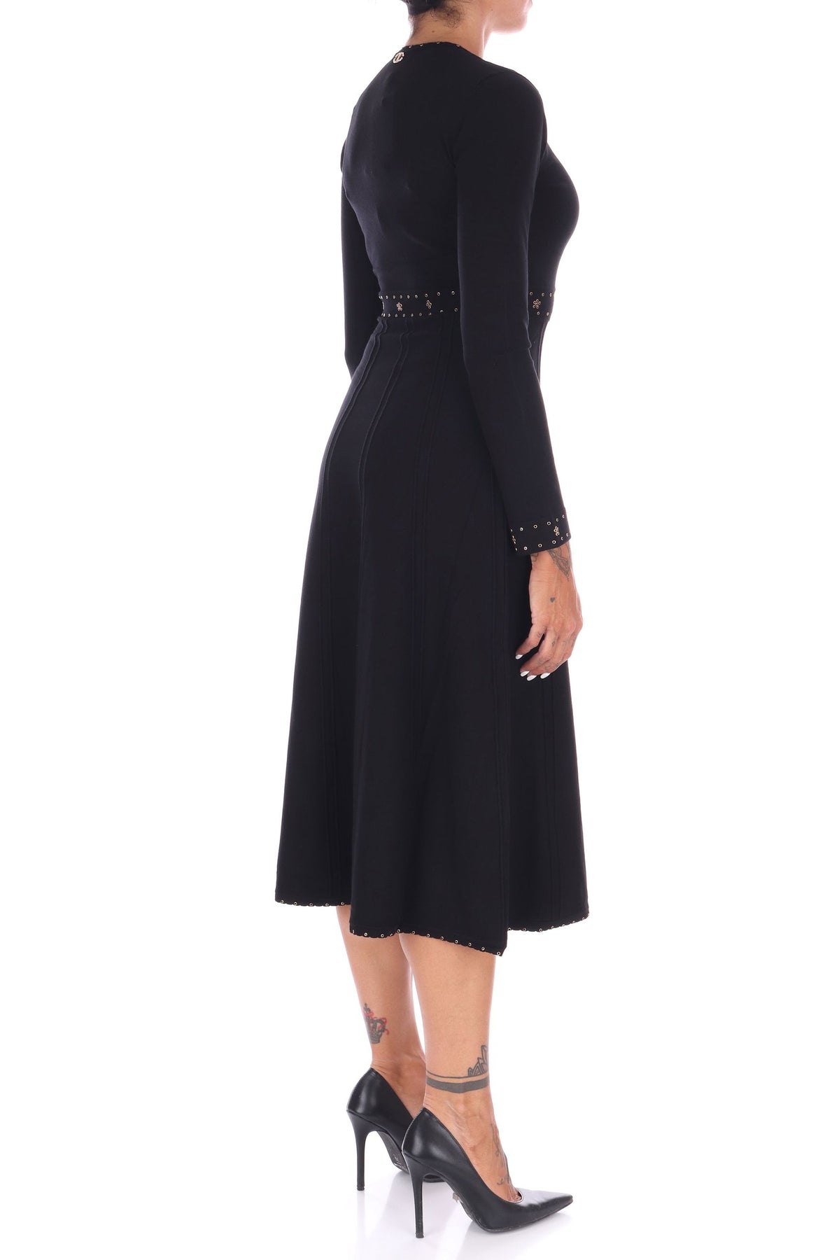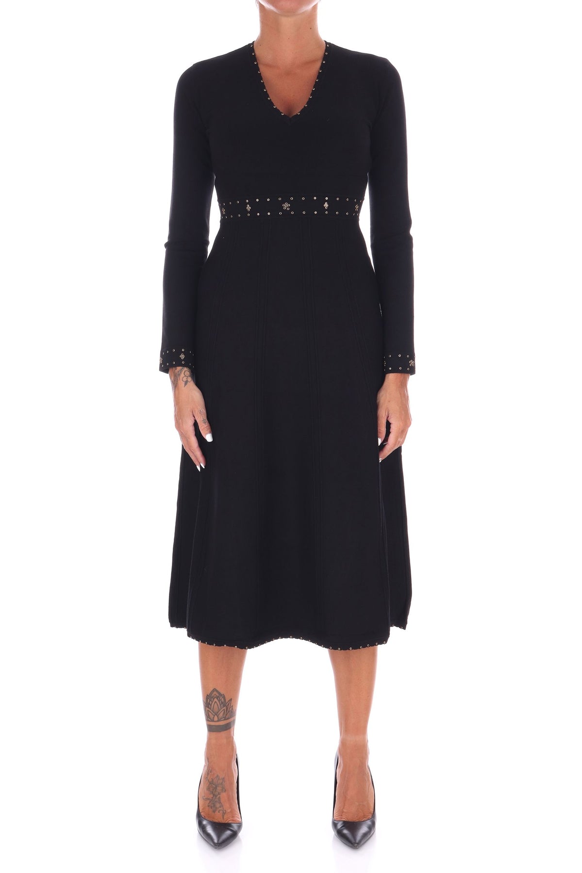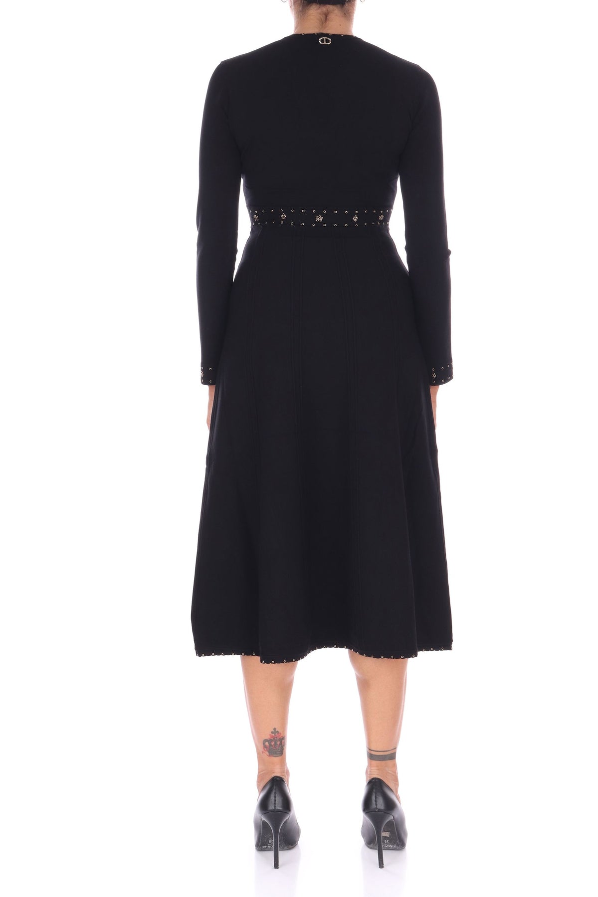 Questo abito midi di TWINSET, realizzato in viscosa stretch, offre una vestibilità slim che valorizza la figura con eleganza. Le applicazioni raffinate su scollo, polsi e vita aggiungono dettagli preziosi, mentre lo scollo a V e il dettaglio Oval T in metallo sul retro collo donano un tocco di raffinatezza. Le maniche lunghe e la gonna svasata con cuciture in rilievo completano un design sofisticato e femminile, ideale per chi desidera uno stile unico e seducente. La modella indossa una Tag S