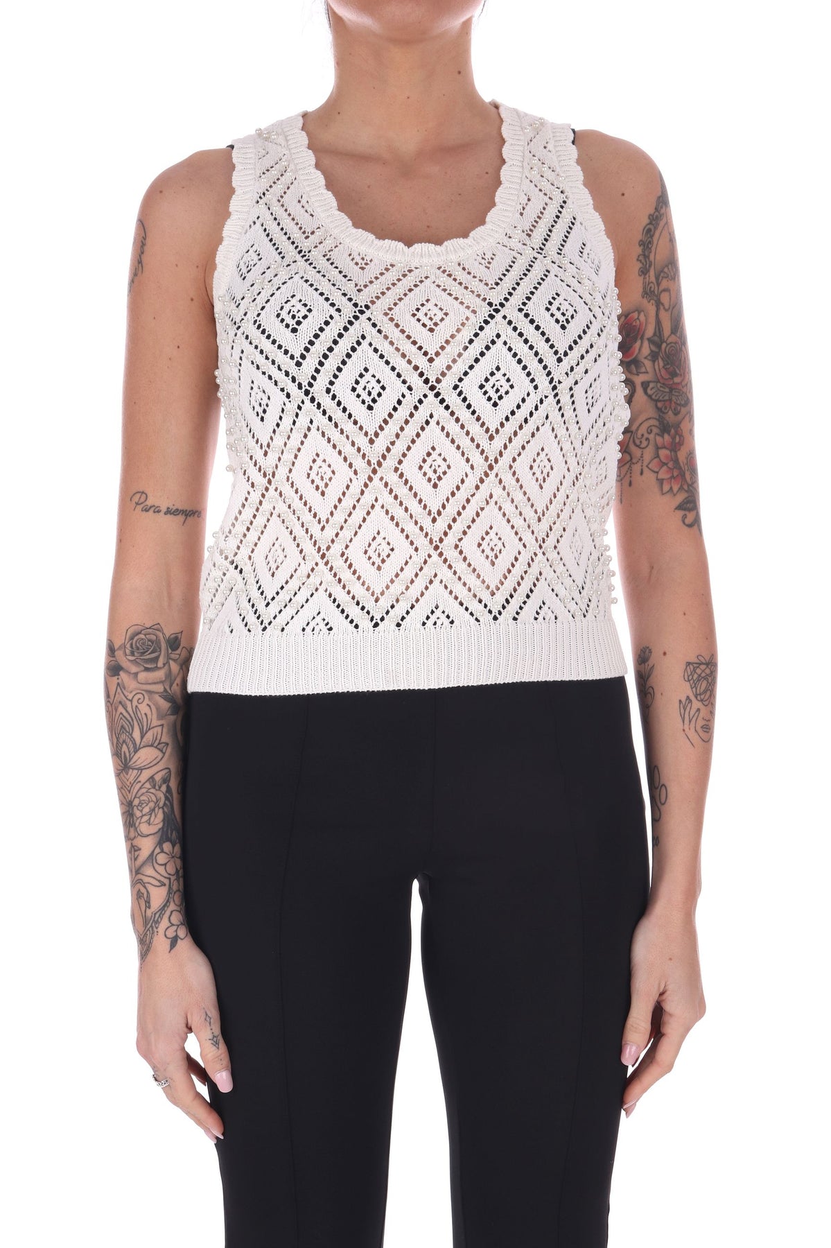 Top in cotone con lavorazione punzonata che disegna eleganti losanghe, impreziosite da perle applicate a rivetto per un tocco di audacia. Collo e giromanica smerlati conferiscono un'estetica raffinata, mentre il fondo a costine assicura una vestibilità impeccabile. La linea fitted abbraccia il corpo con sicurezza, creando una silhouette decisa e moderna. Un capo che non passa inosservato. La modella indossa una Tag S Collezione P/E26