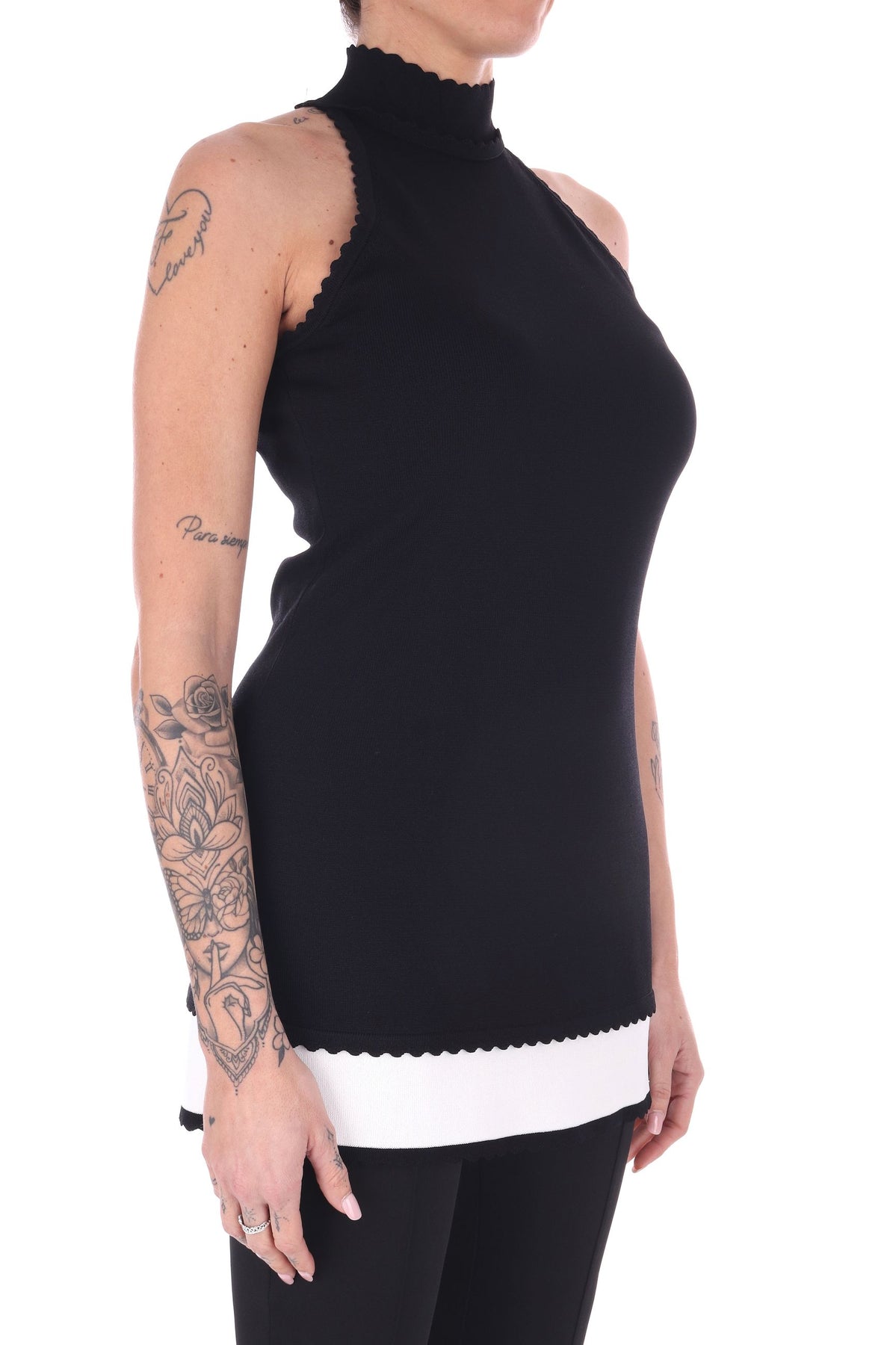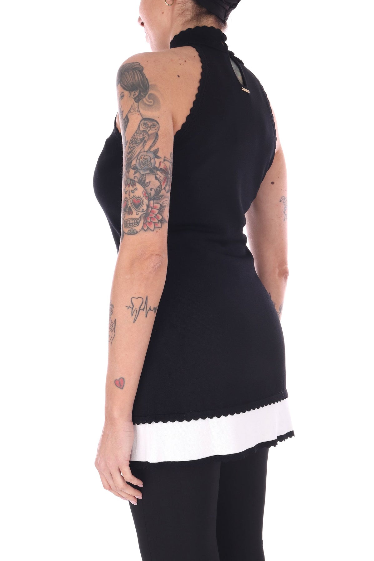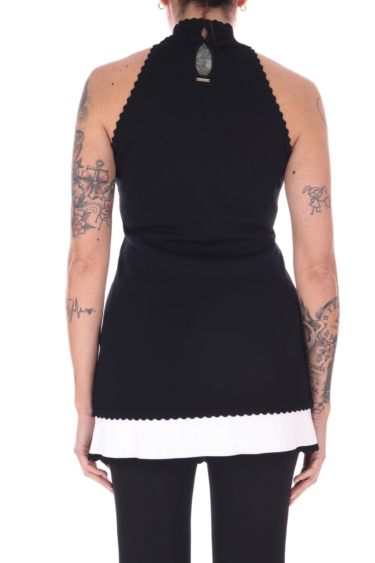 Viscosa stretch bicolor in una tessitura compatta che abbraccia il corpo con sicurezza. Gli smerli di dimensioni diverse sui profili aggiungono movimento e texture, mentre la scollatura halter espone le spalle con intenzionalità. La linea fitted che si svasata al fondo crea una silhouette che seduce senza supplicare. Un abito corto che sa esattamente chi è e cosa vuole. La modella indossa una Tag S Collezione P/E26
