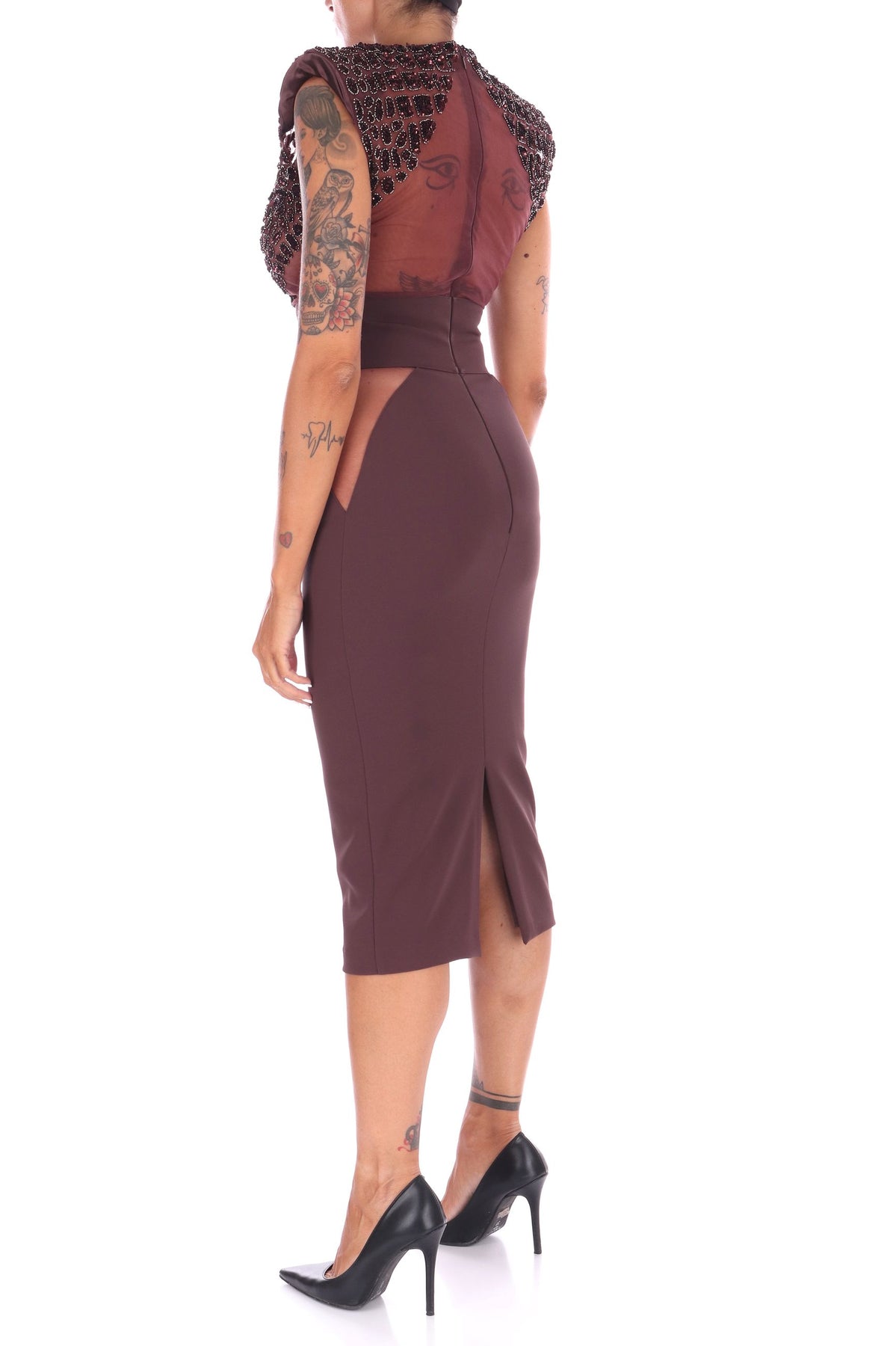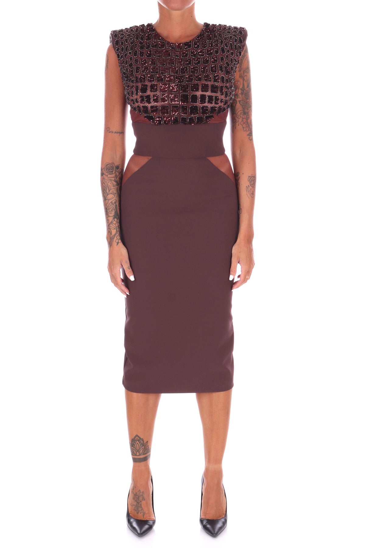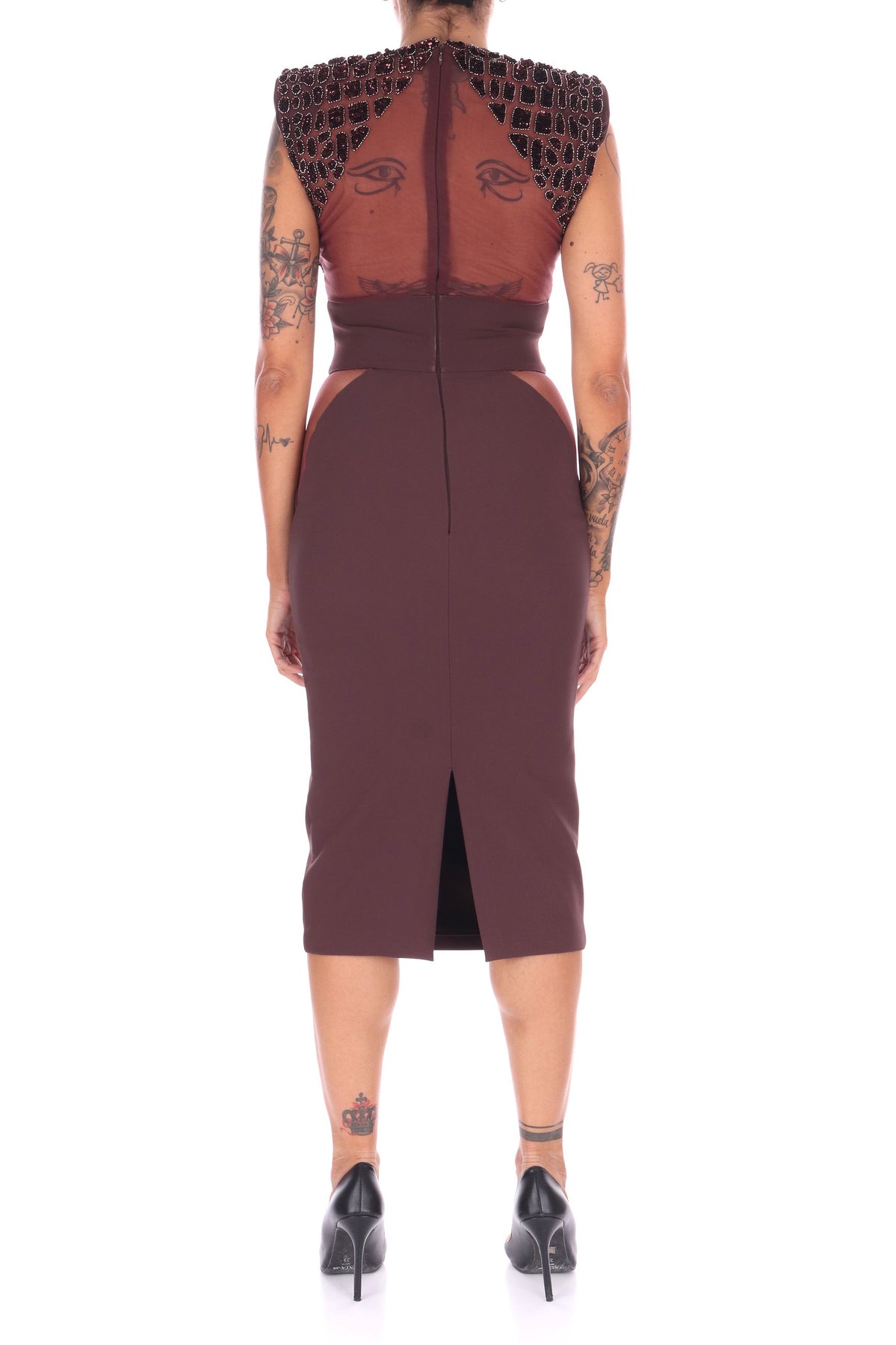 Questo abito midi in crêpe leggero dalla vestibilità aderente spicca per le spalle strutturate e il top decorato con brillanti ricami a motivo cocco, che donano luce e profondità alla texture. I tagli cut-out con inserti in tulle valorizzano la linea decisa del capo, creando una silhouette geometrica e moderna. Un capo raffinato e d’impatto, perfetto per chi desidera un look sofisticato e distintivo.