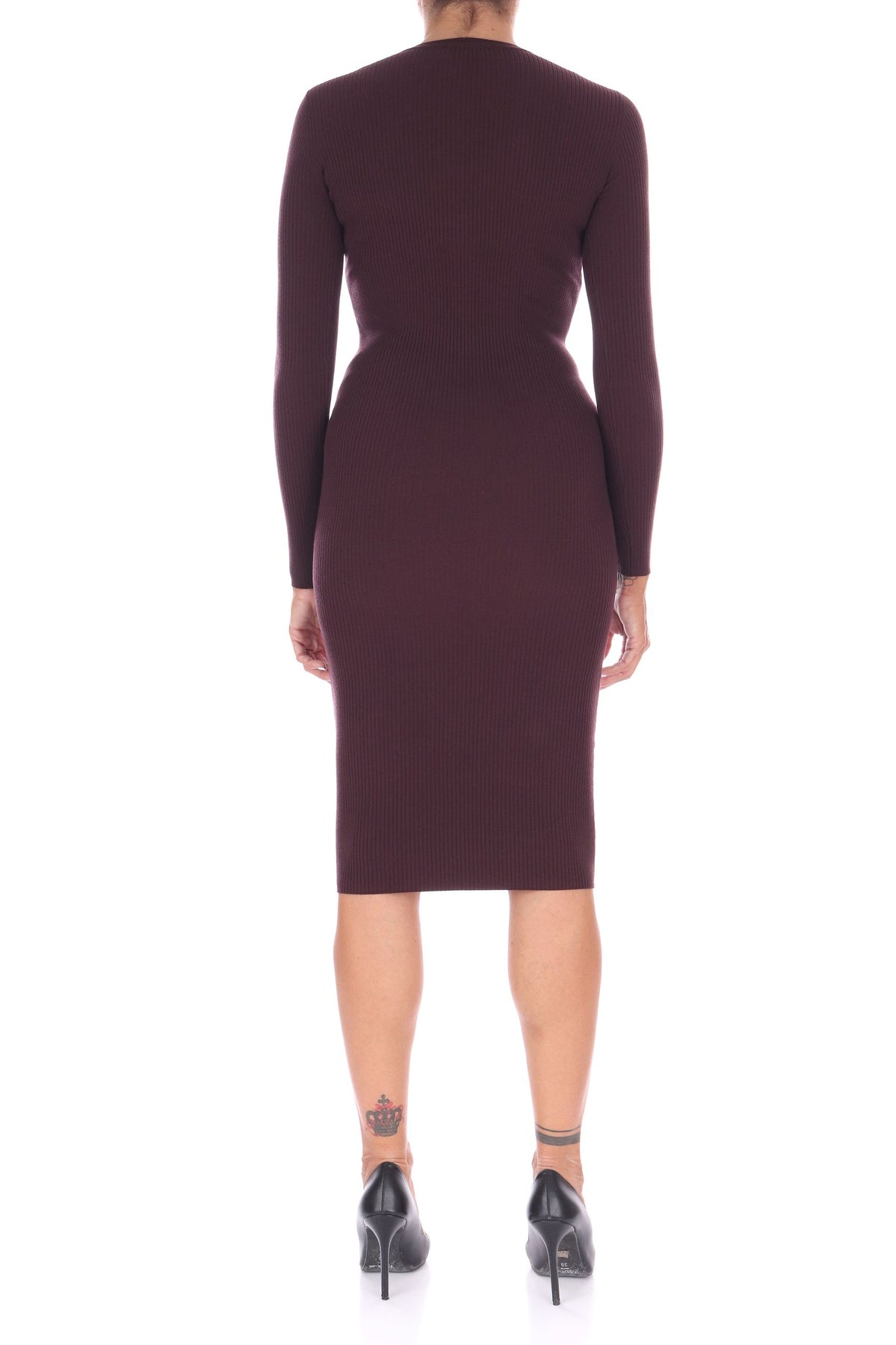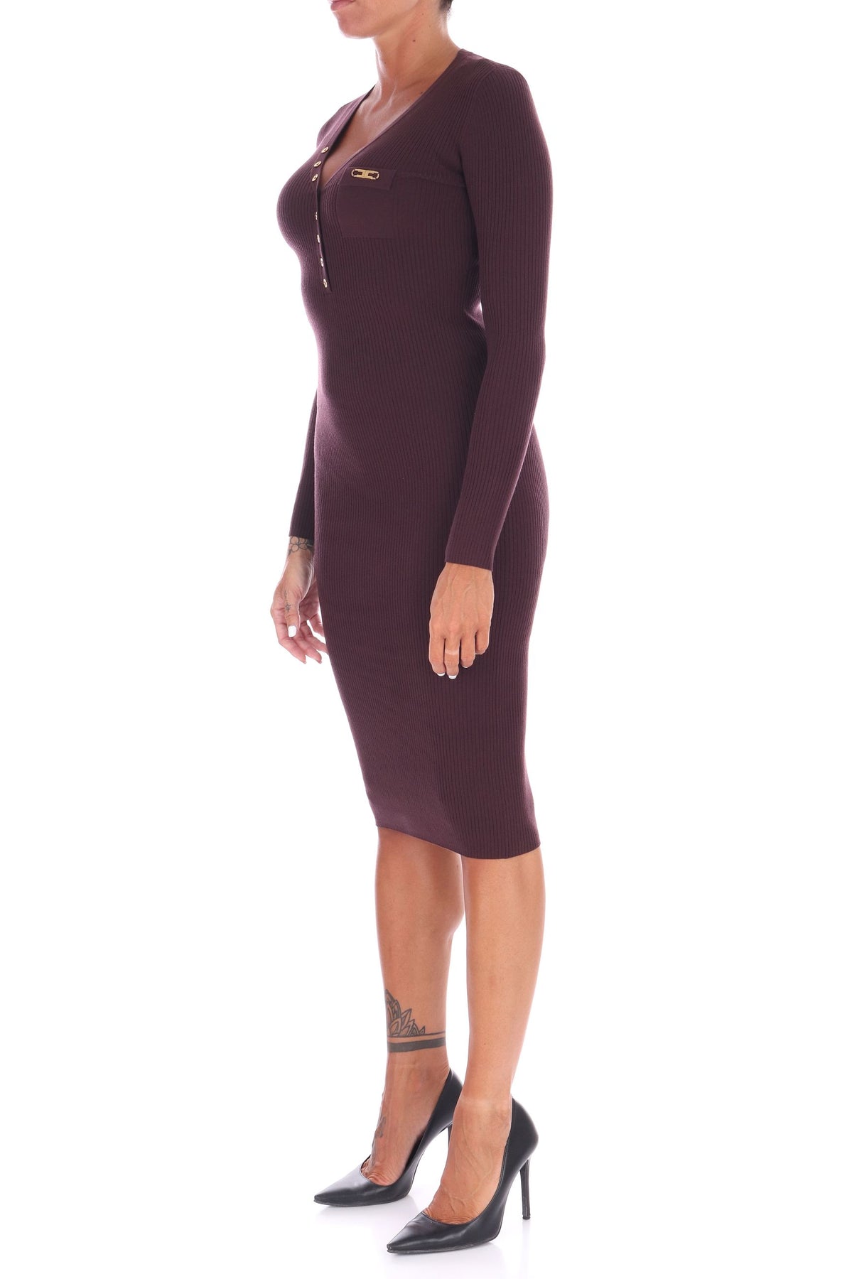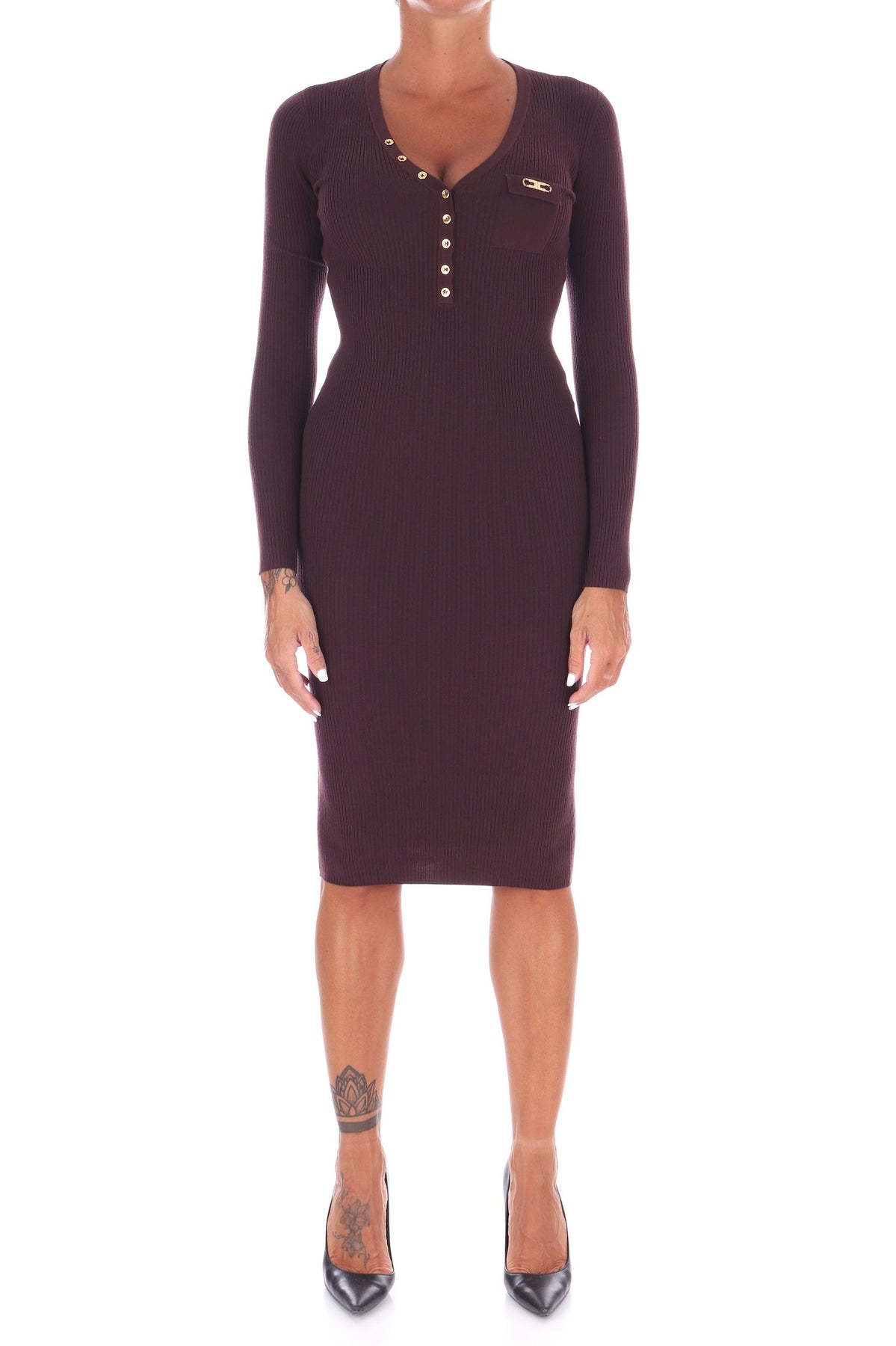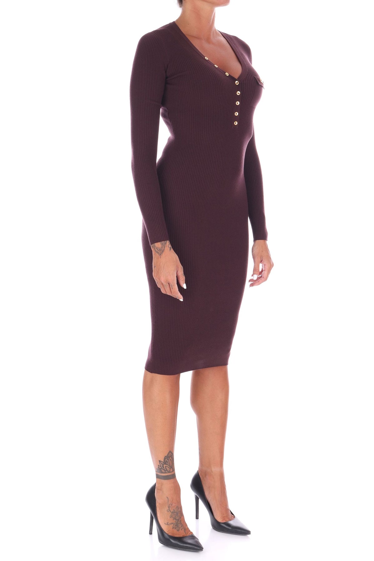 L'abito a tubino in maglia avvolge la silhouette con una vestibilità aderente e un tocco di allegria. Il suo scollo a V con bottoni e le maniche lunghe aggiungono stile, mentre la gonna longuette trasmette eleganza. L’elaborata lavorazione a costine crea un gioco di texture tra definizione e morbidezza, regalando un aspetto dinamico. Il taschino in raso con logo dorato aggiunge un dettaglio raffinato che chiude il look con un sorriso di classe. La modella indossa una Tag 42 italiana
