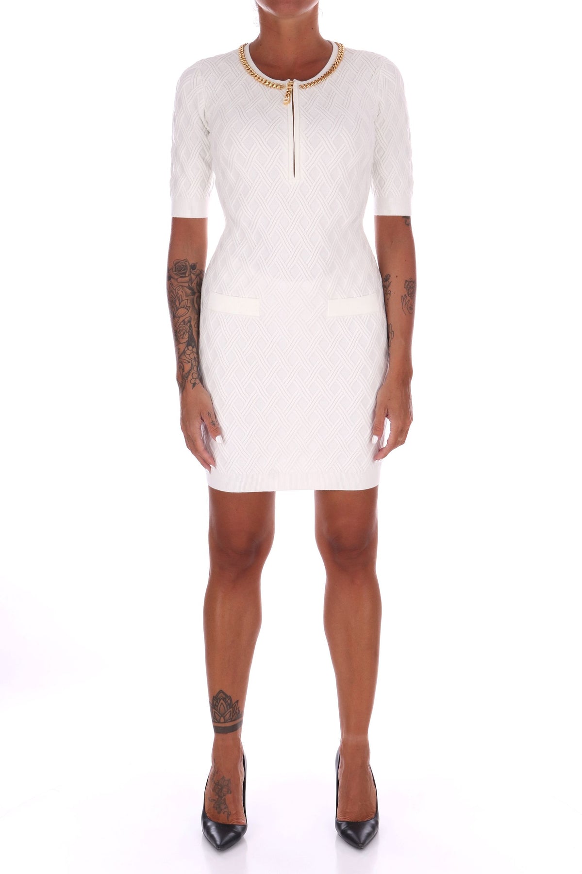 L'abito mini in maglia aderente valorizza la silhouette con una lavorazione 3D unica, che disegna motivi geometrici a rombi su tutta la lunghezza. Il girocollo e le maniche sopra al gomito conferiscono un’eleganza moderna, mentre la catena groumette aggiunge un tocco prezioso e distintivo. Lo scollo con zip e tirazip gioiello con logo completano il capo, rendendolo la scelta ideale per chi desidera un look sofisticato e di forte impatto. La modella indossa una Tag 42 italiana