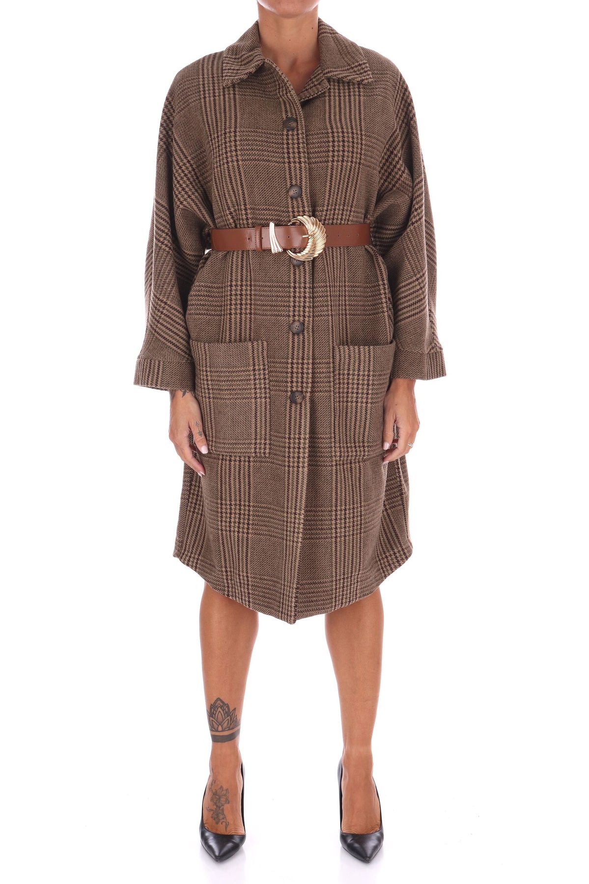 Il cappotto in fantasia Galles unisce stile e praticità con due ampie tasche frontali che creano un'atmosfera rilassata. Il colletto a punta aggiunge un dettaglio distintivo, mentre la cintura in vita con fibbia dorata valorizza la silhouette con un tocco di eleganza. Perfetto per chi cerca un capo versatile, che combina comfort e classe in ogni occasione. La modella indossa una Tag S