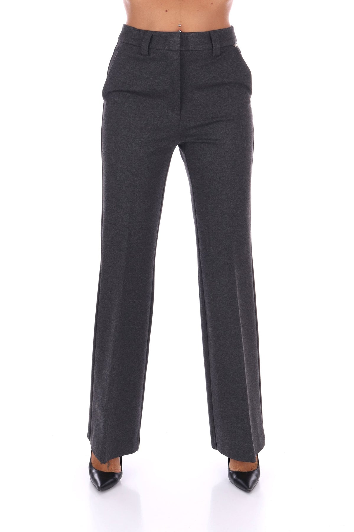 Pantaloni eleganti che proclamano sofisticazione attraverso la struttura. Jersey mélange punto milano crea una texture compatta che valorizza ogni movimento, mantenendo forma e morbidezza che sfidano il tempo. La vita media si posiziona con equilibrio consapevole, la gamba a zampa aggiunge un movimento audace e retrò che rifiuta l'anonimato. La piega stirata sul davanti mantiene le linee nette e definite, le comode tasche garantiscono praticità senza sacrificare l'eleganza. Le tasche a filetto sul dietro preservano la silhouette raffinata, mentre la chiusura con zip nascosta aggiunge un dettaglio di controllo sofisticato. La modella indossa una Tag 42 italiana