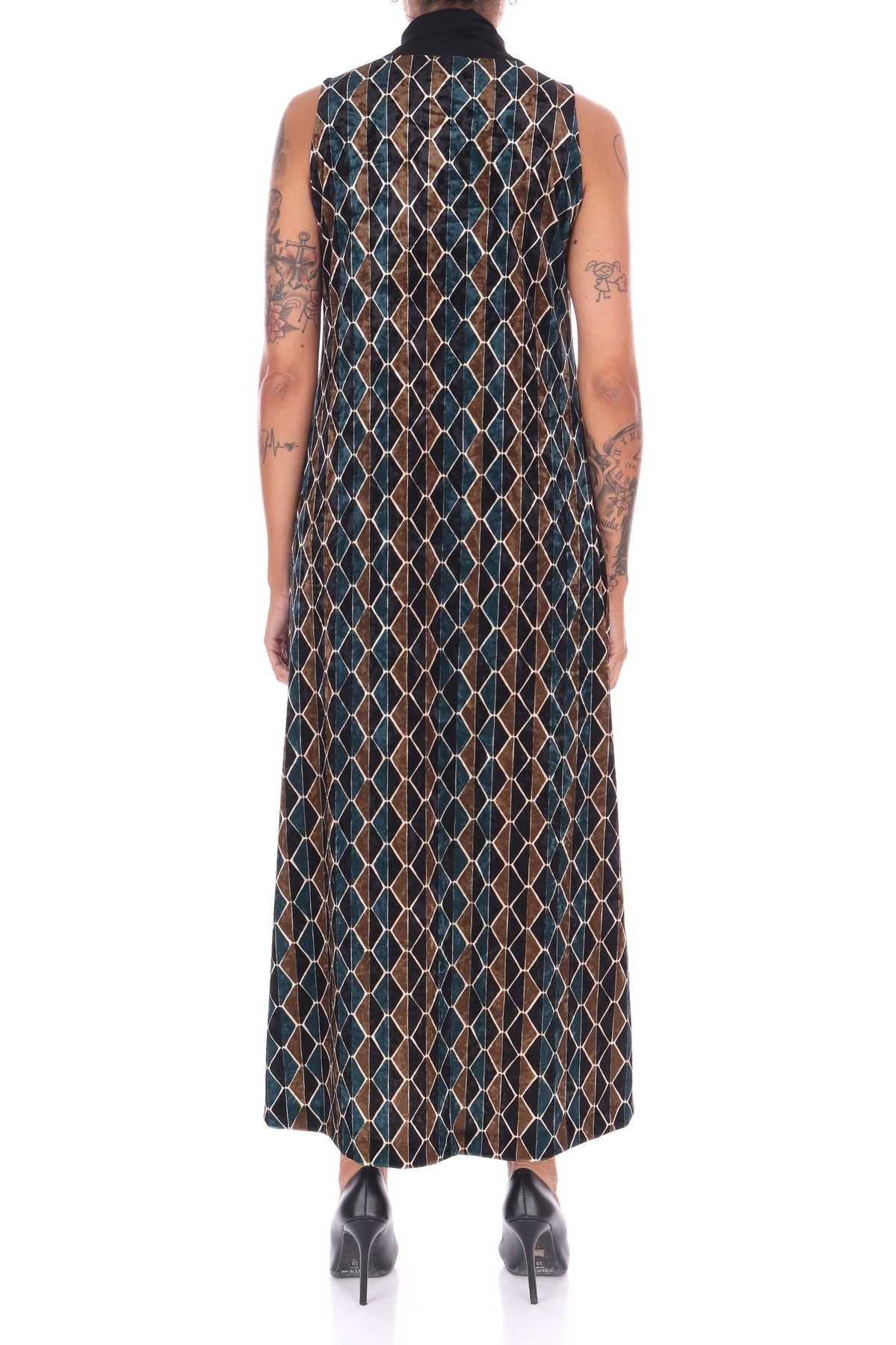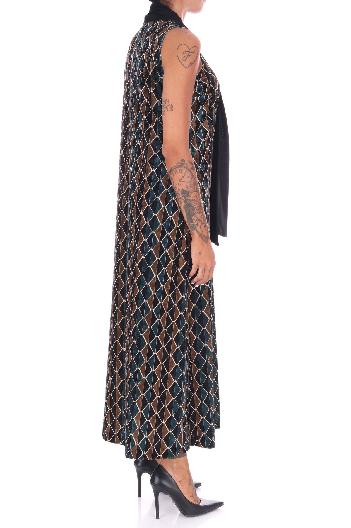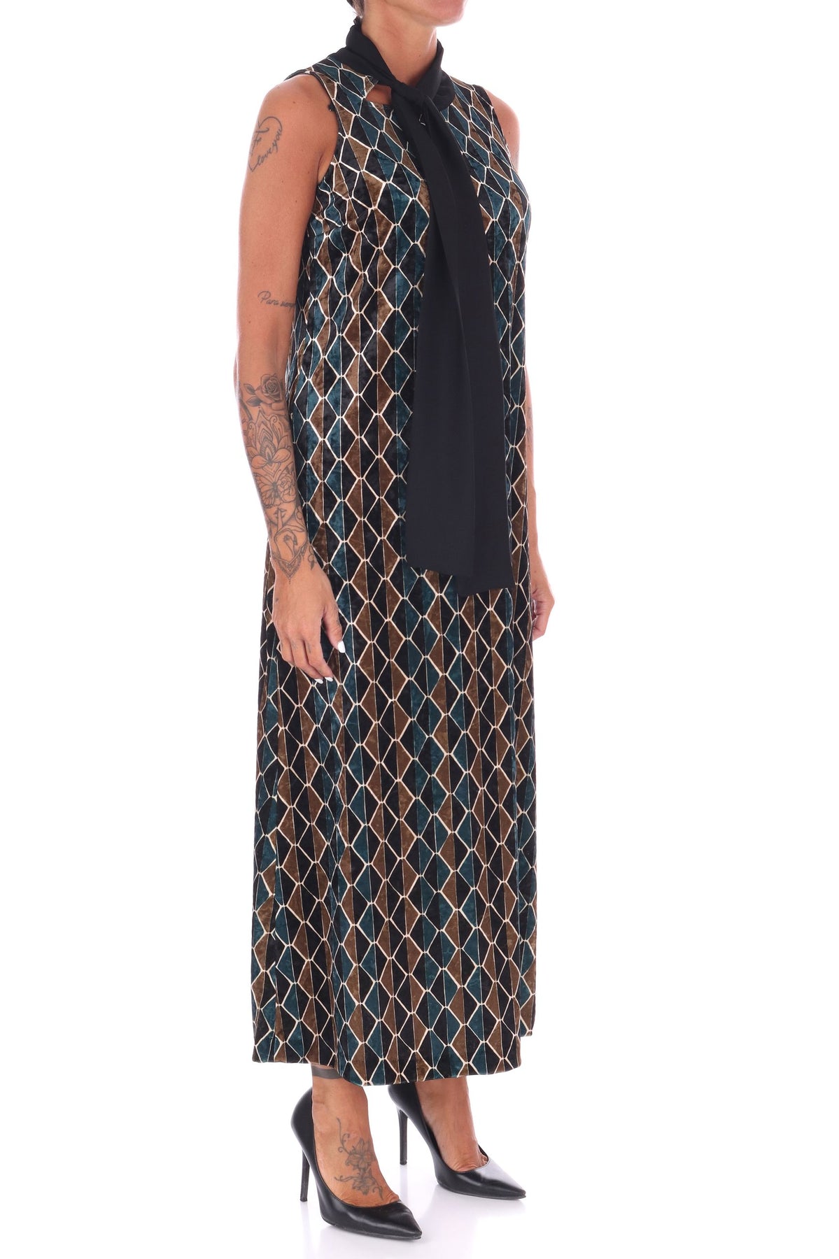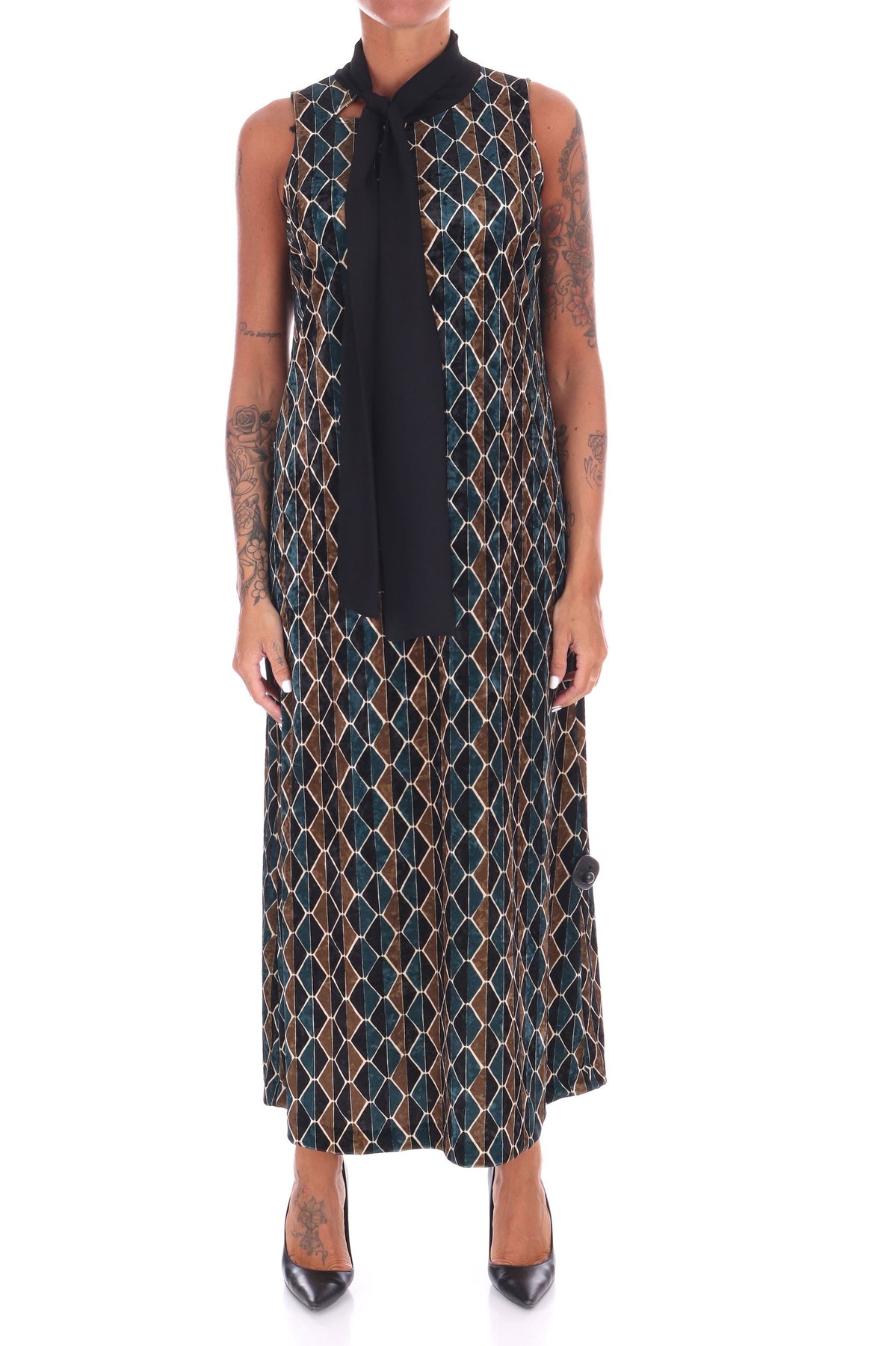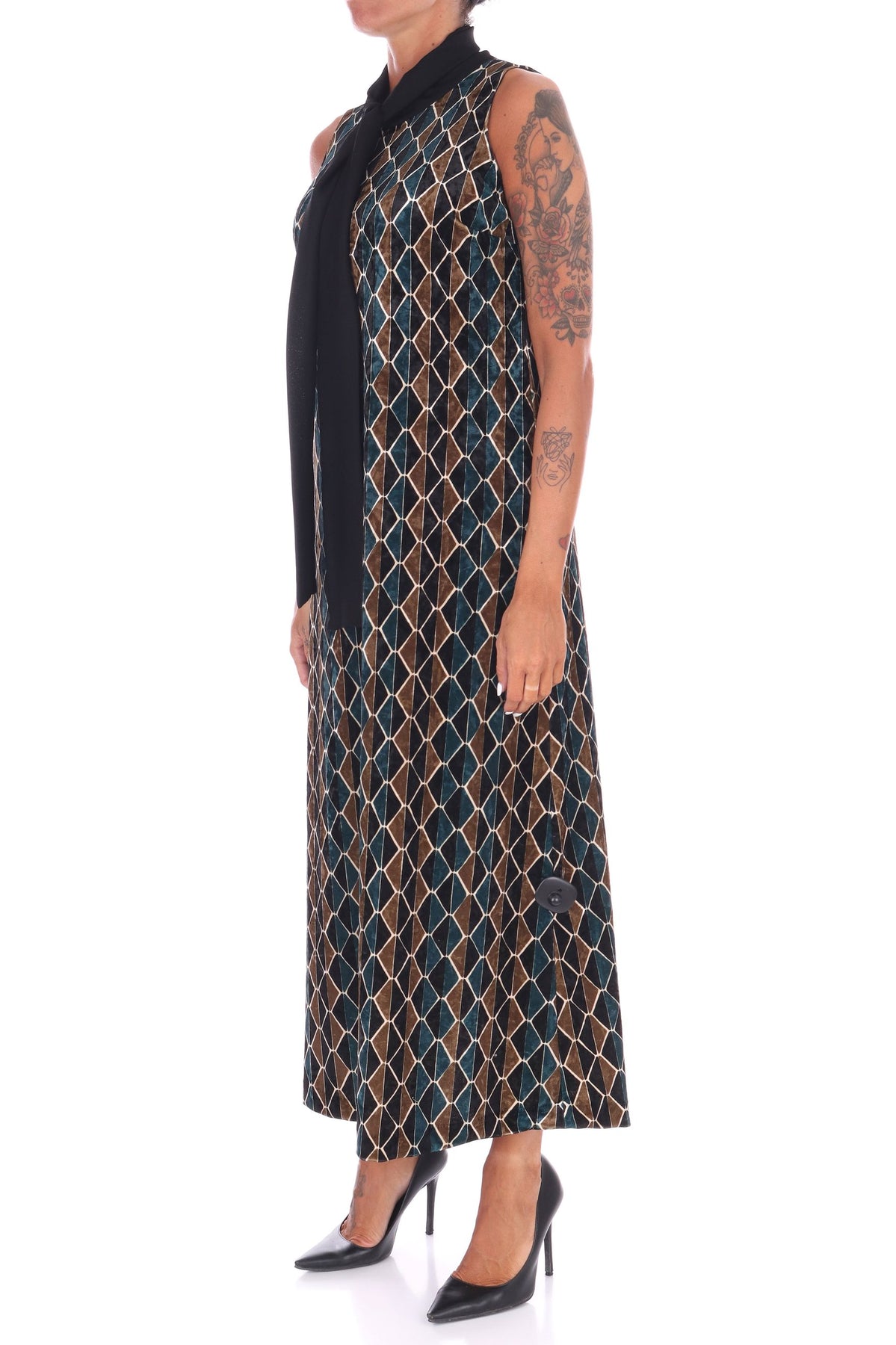 Scopri l'eleganza senza tempo di questo abito lungo in velluto multicolor, arricchito da una raffinata fusciacca al collo che valorizza ogni silhouette. La vestibilità fluida garantisce comfort e libertà di movimento, mentre i colori vivaci donano un tocco di originalità al tuo guardaroba. Perfetto per serate speciali o occasioni in cui vuoi distinguerti con stile e classe. La modella indossa una Tag 42 italiana
