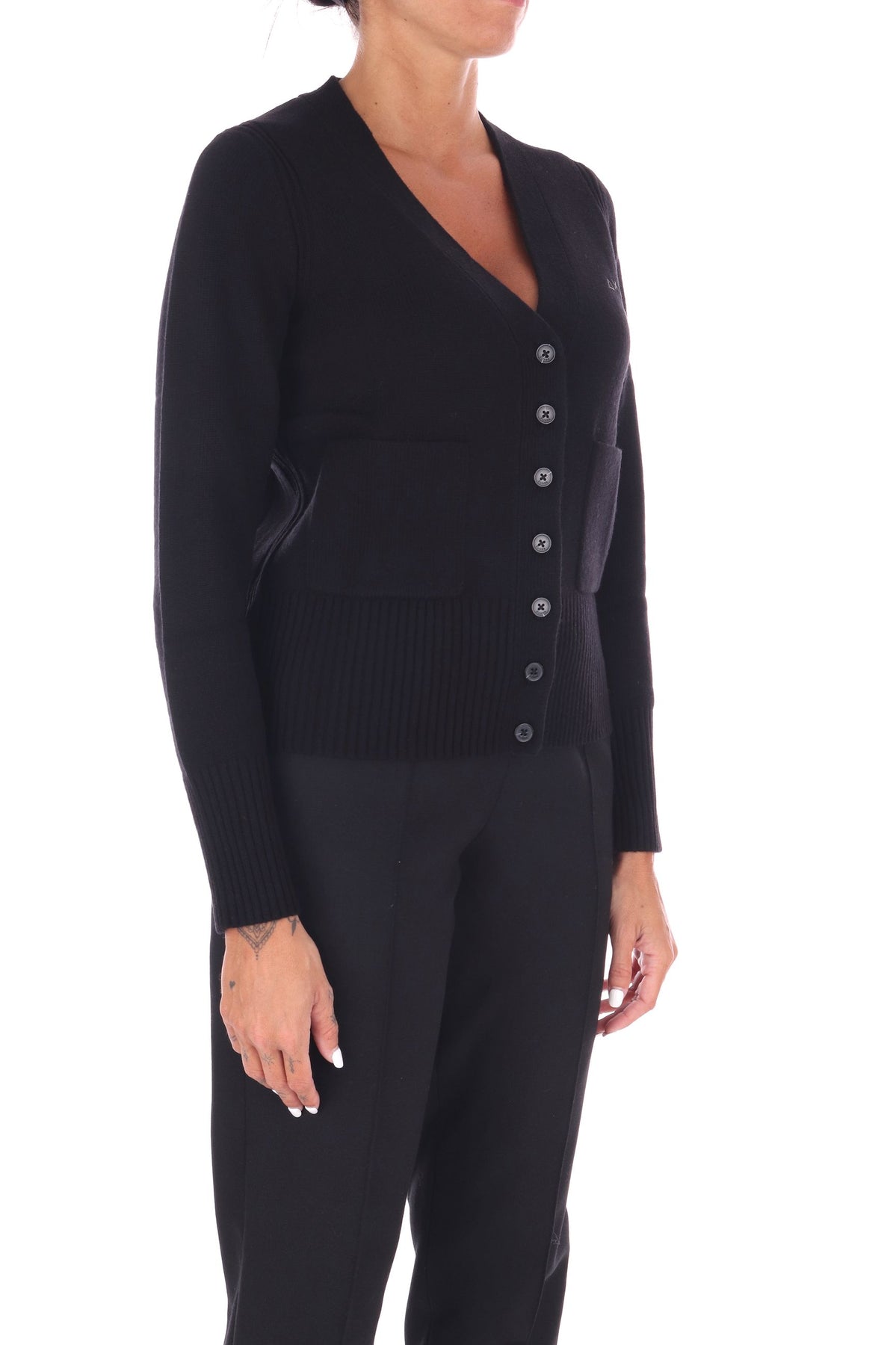 Cardigan in misto lana con abbottonatura centrale offre calore e stile in un unico capo. I bottoni a vista tono su tono e lo scollo a punta aggiungono eleganza discreta, mentre le grandi tasche applicate sul davanti garantiscono praticità senza rinunciare al design. Perfetto per completare il tuo look con comfort e classe. La modella indossa una Tag S