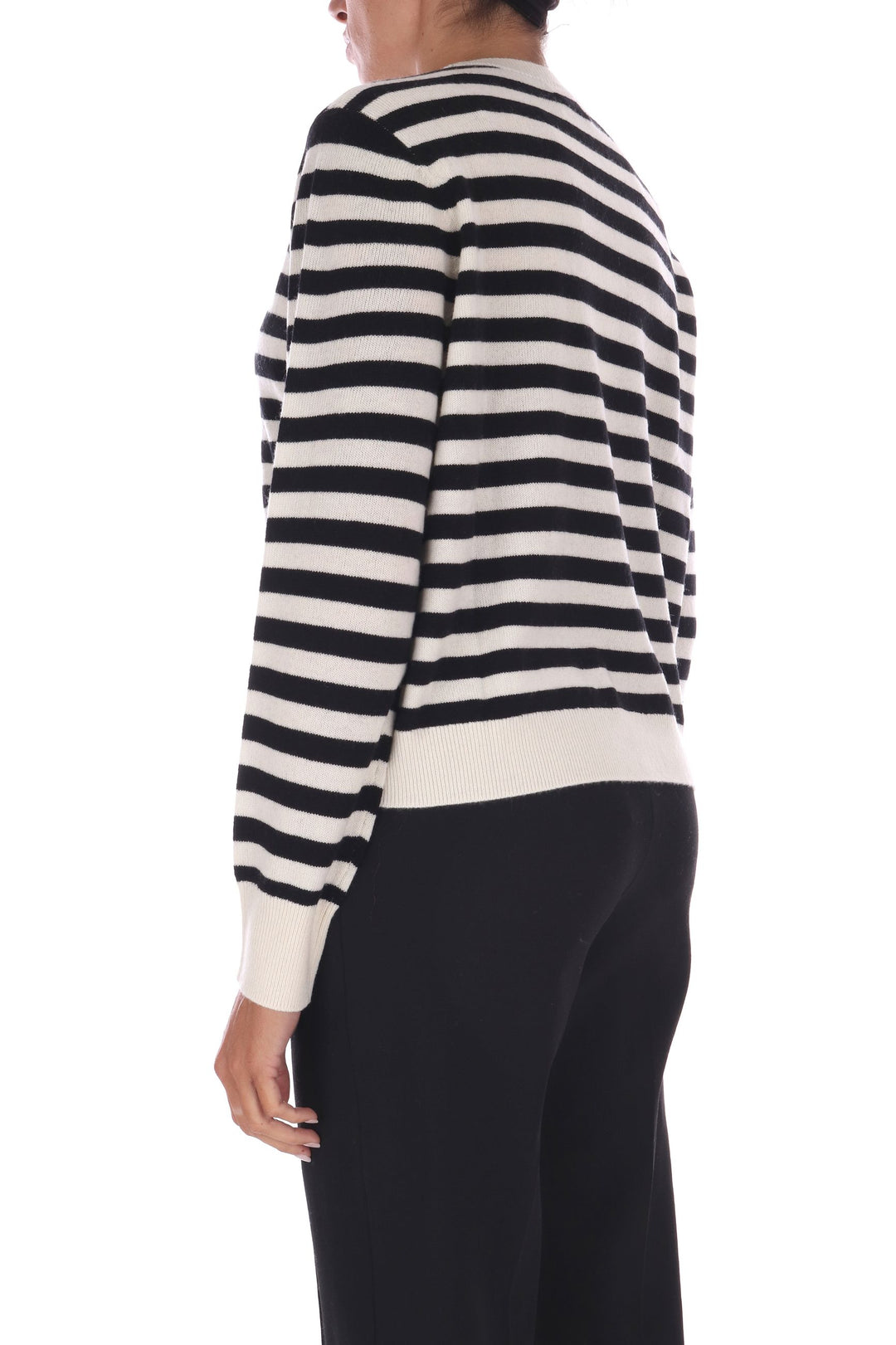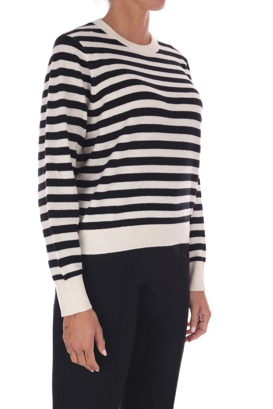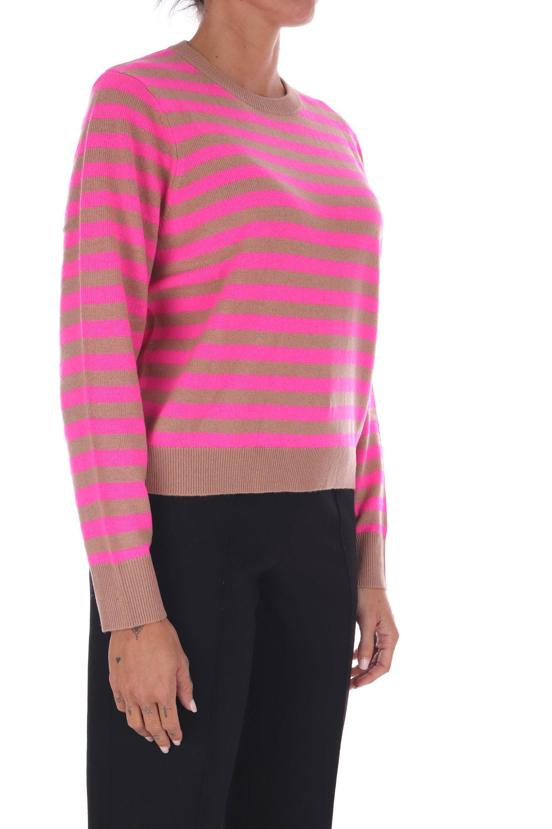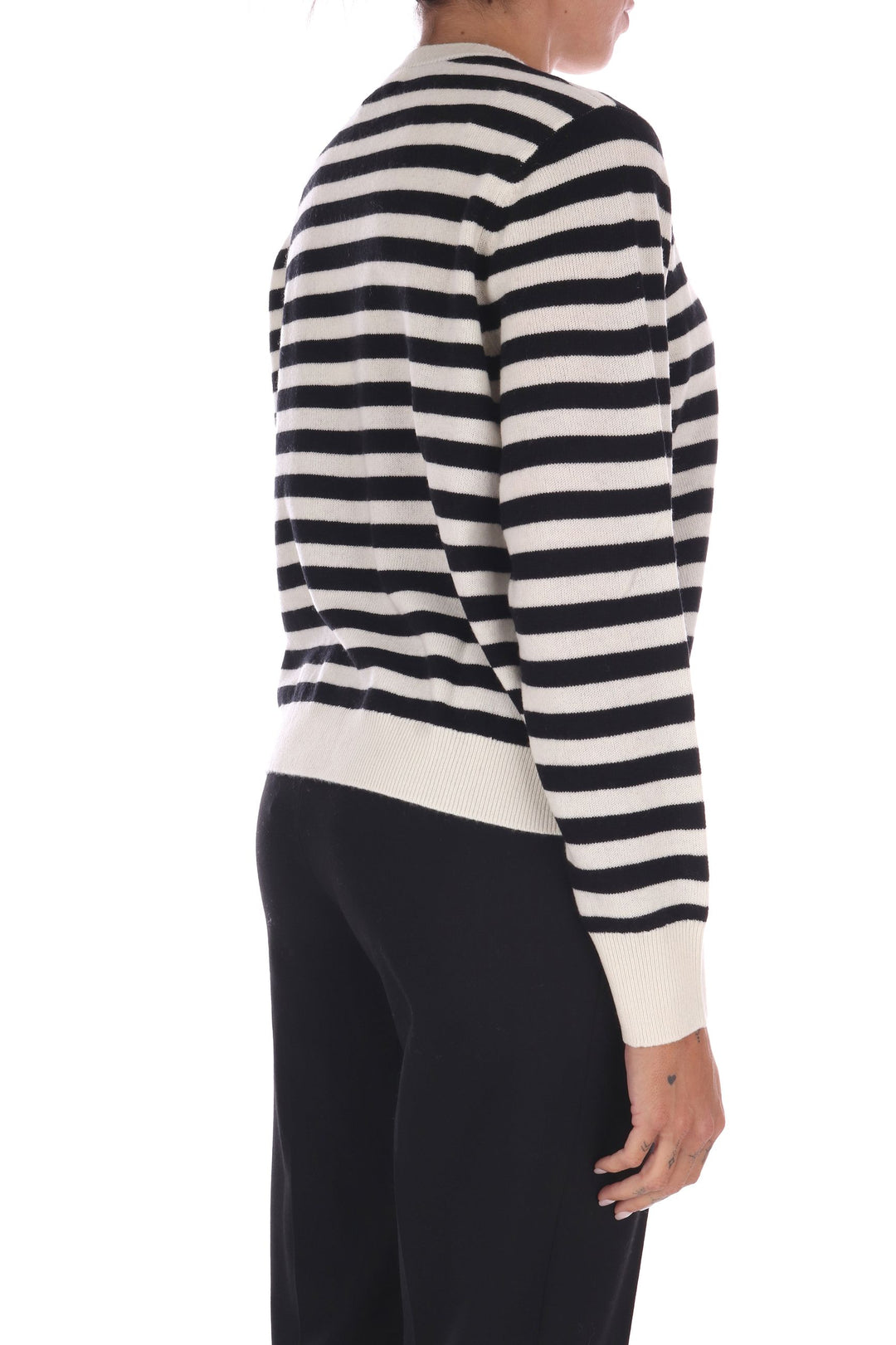 La maglia a righe bicolore in lana unisce uno stile fresco e vivace a una vestibilità a scatola comoda e moderna. Morbida e calda, è perfetta per chi desidera un capo versatile che valorizzi ogni outfit con un tocco di carattere e comfort quotidiano. La modella indossa una Tag S