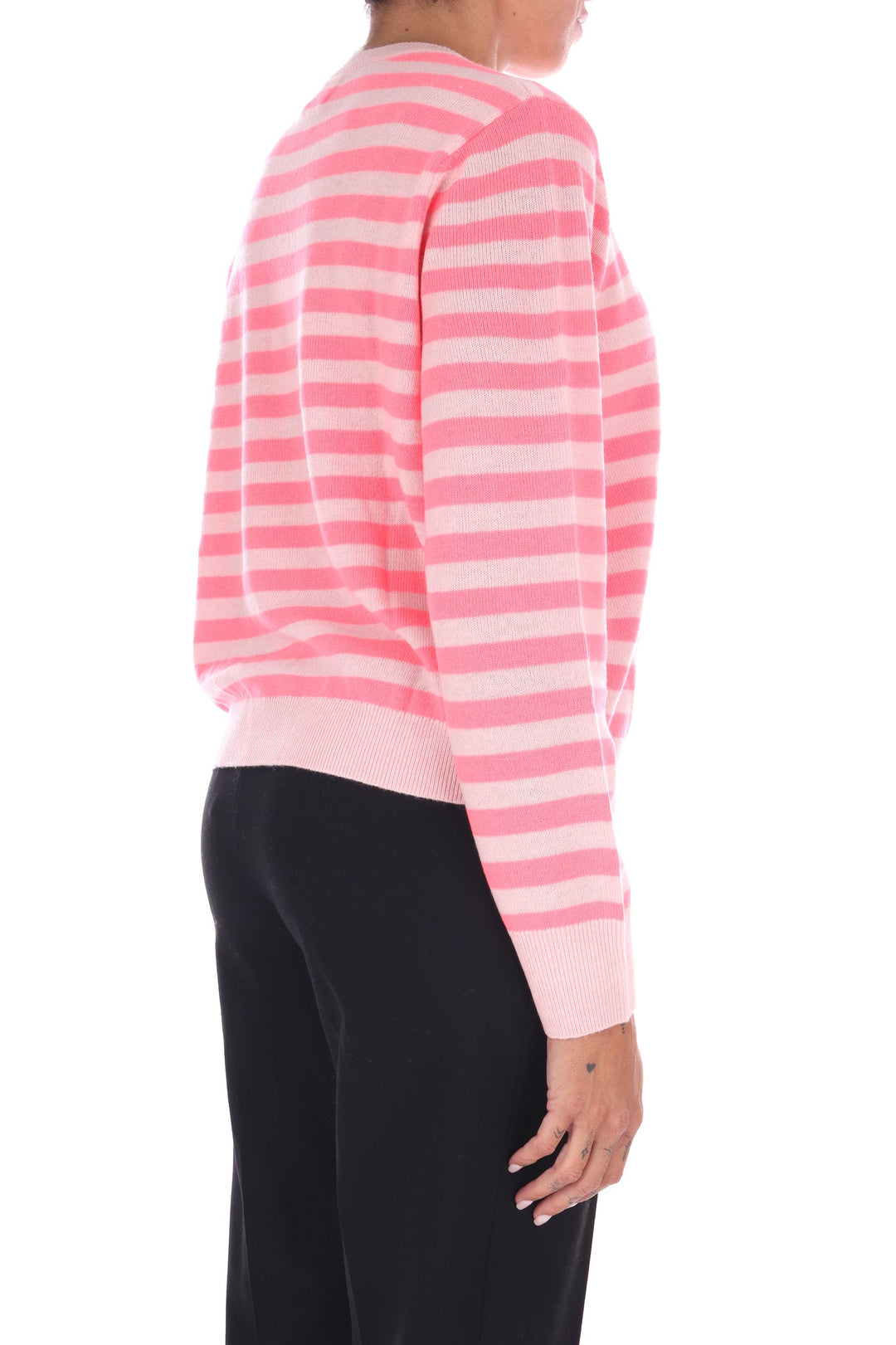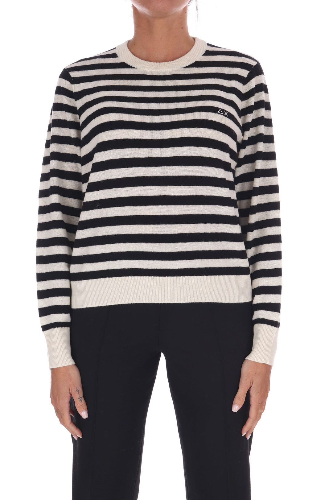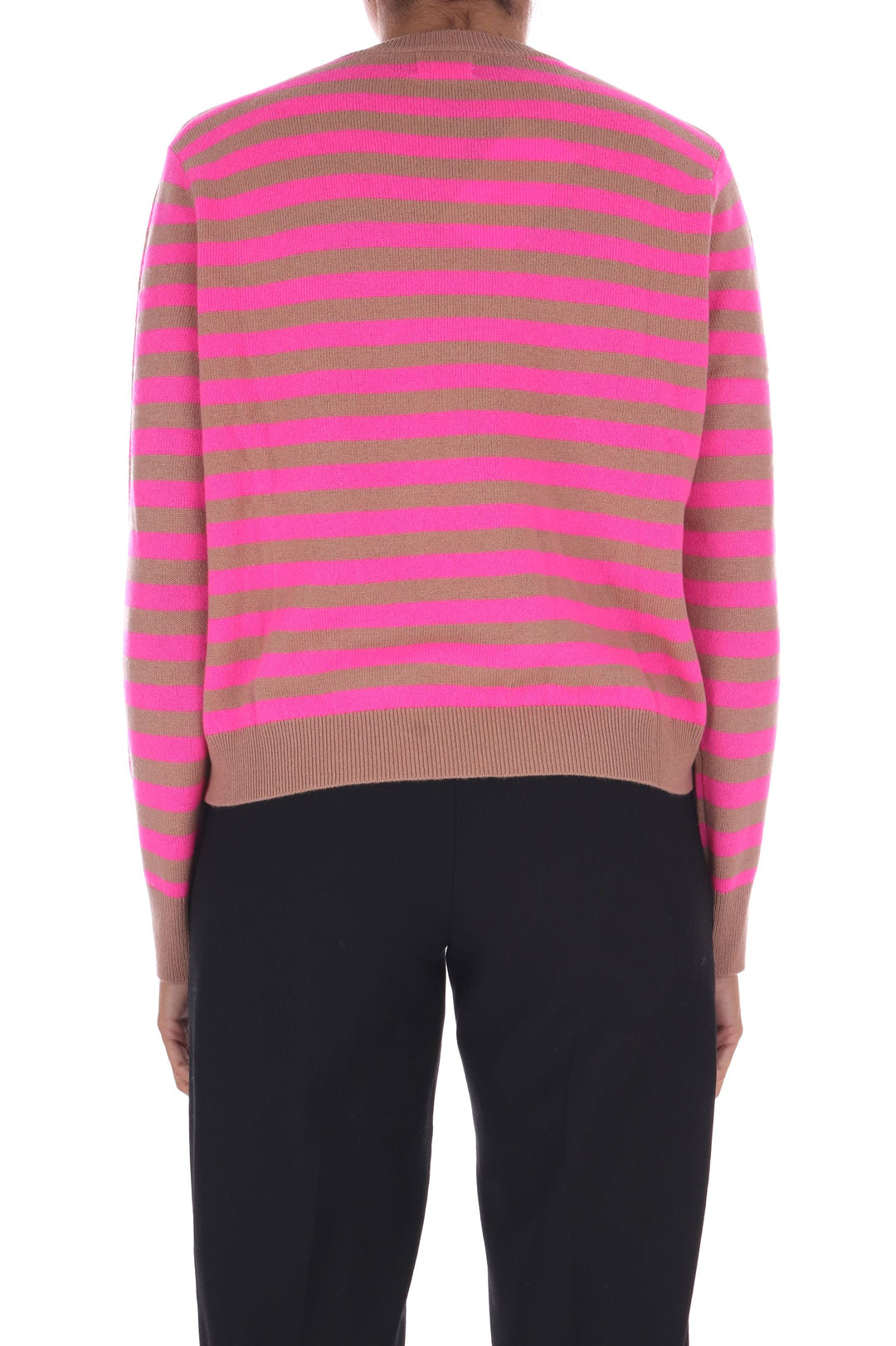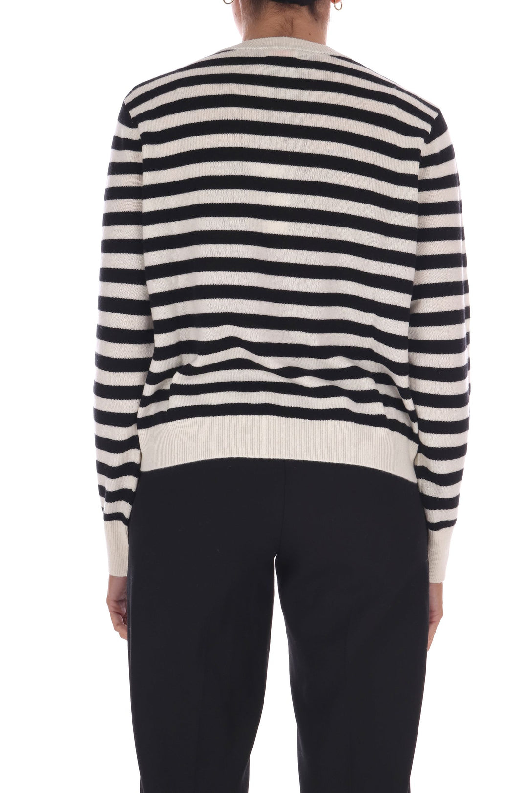 La maglia a righe bicolore in lana unisce uno stile fresco e vivace a una vestibilità a scatola comoda e moderna. Morbida e calda, è perfetta per chi desidera un capo versatile che valorizzi ogni outfit con un tocco di carattere e comfort quotidiano. La modella indossa una Tag S
