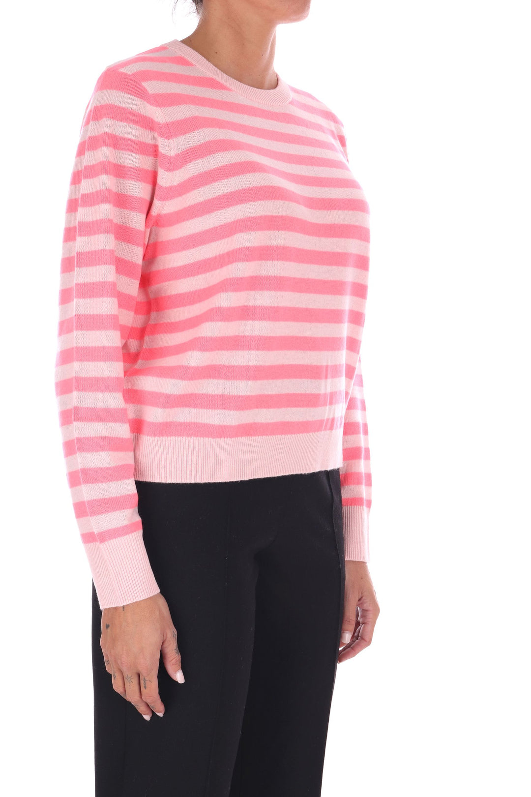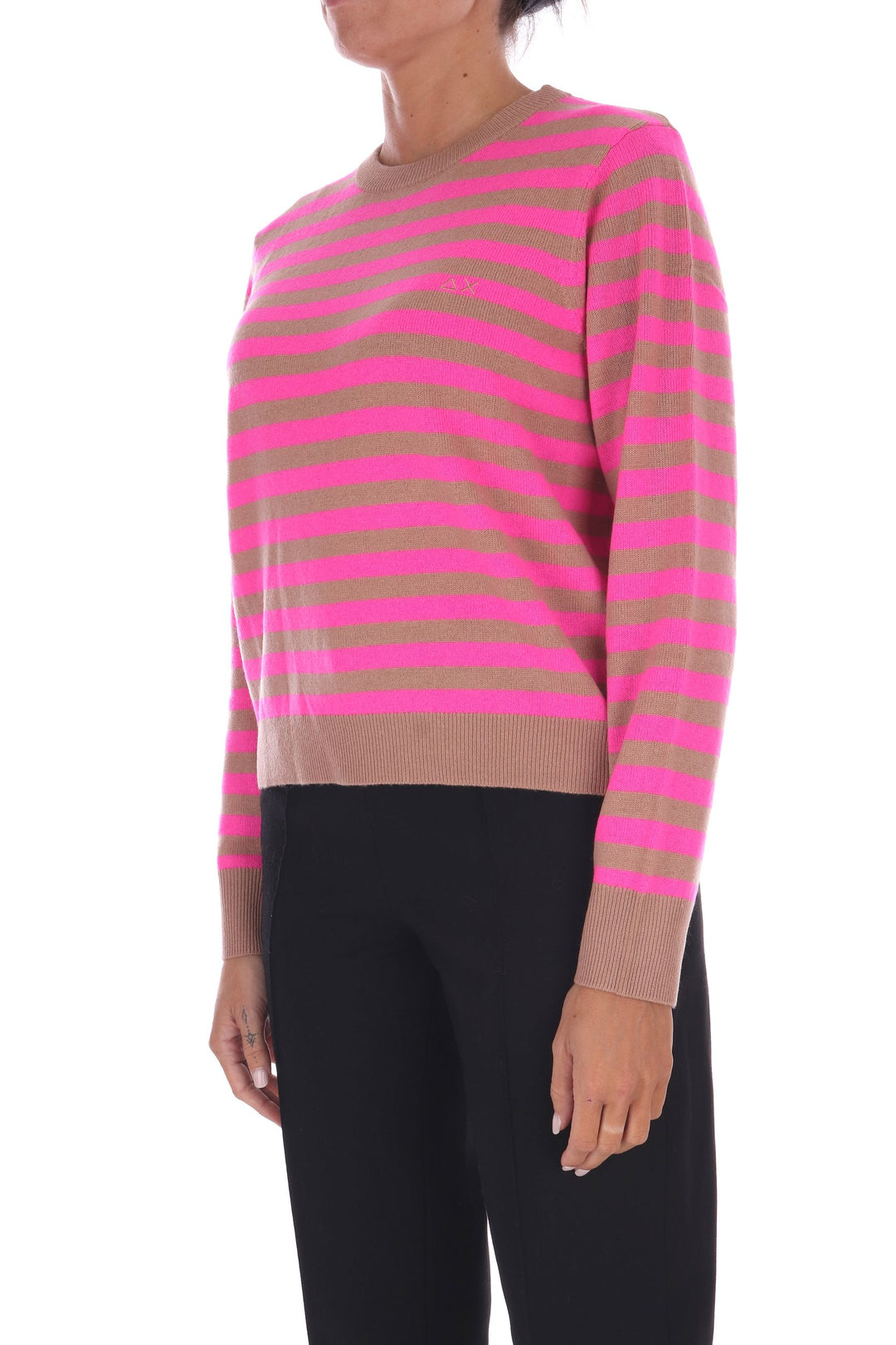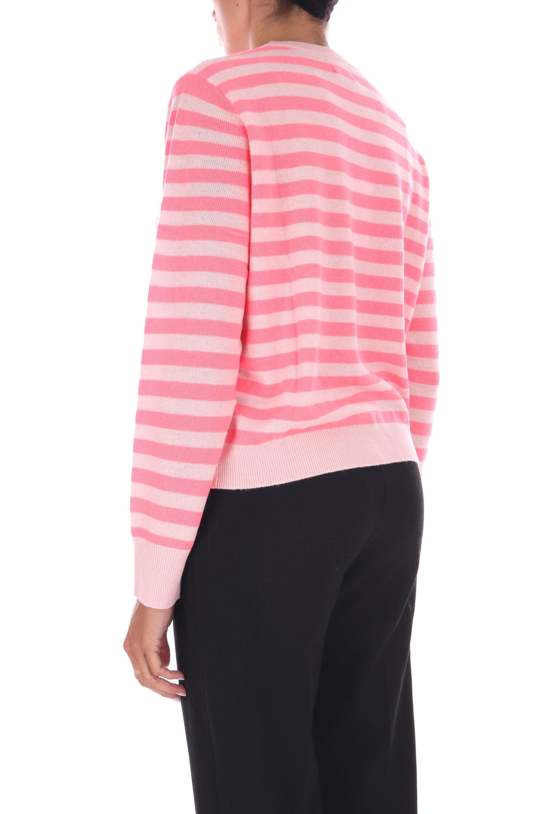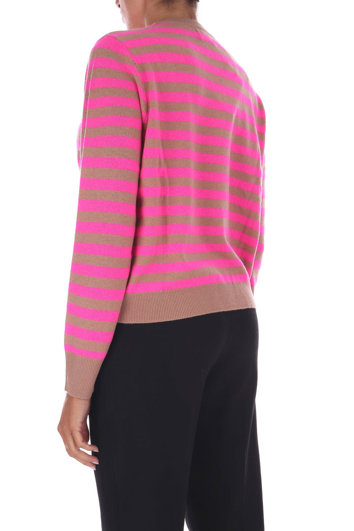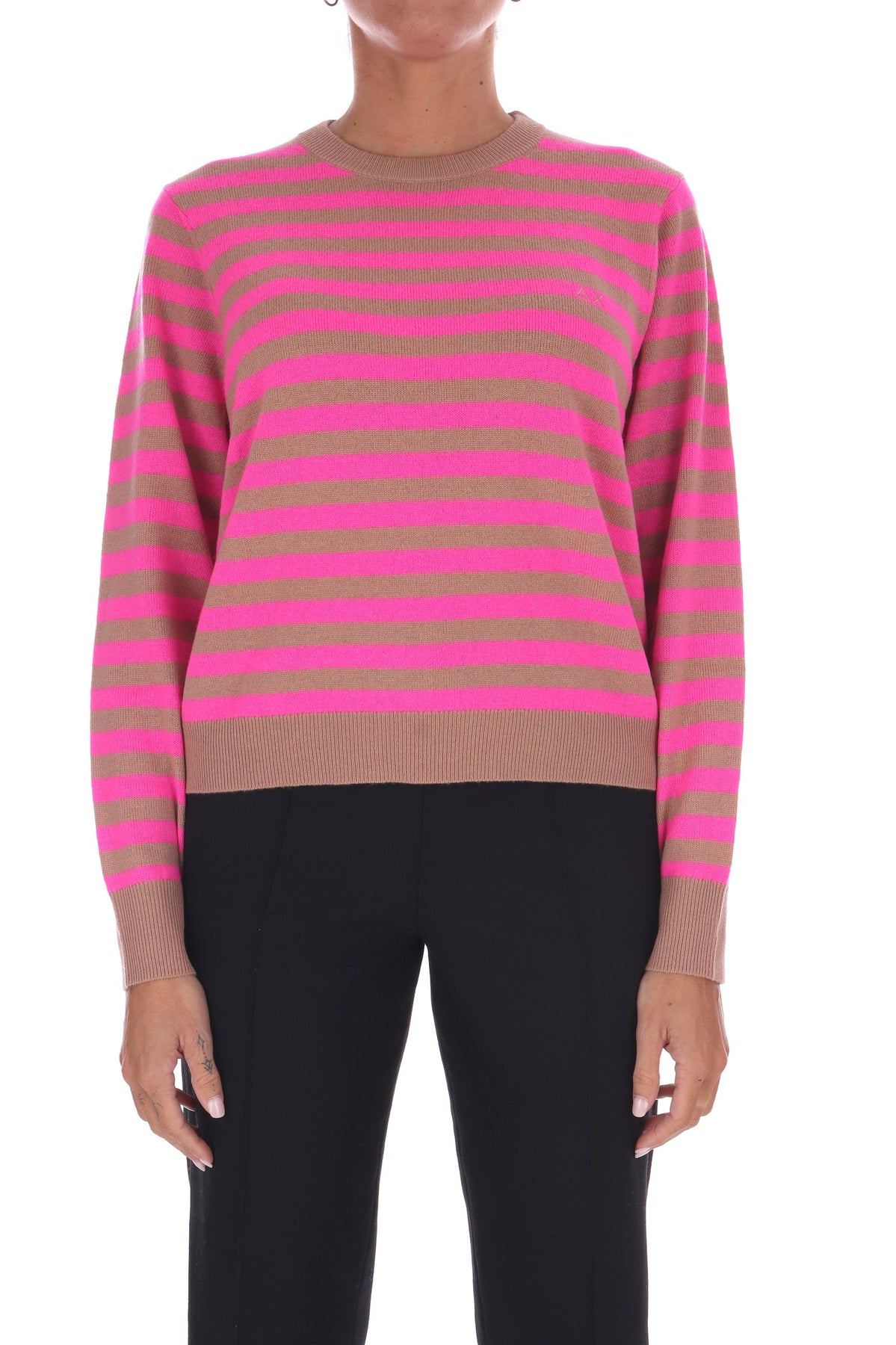 La maglia a righe bicolore in lana unisce uno stile fresco e vivace a una vestibilità a scatola comoda e moderna. Morbida e calda, è perfetta per chi desidera un capo versatile che valorizzi ogni outfit con un tocco di carattere e comfort quotidiano. La modella indossa una Tag S