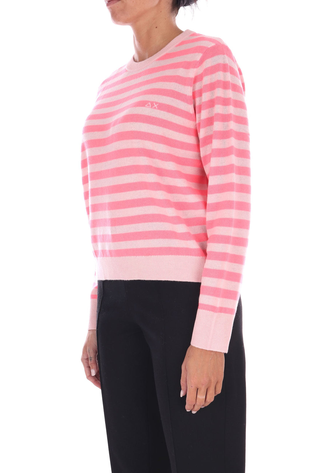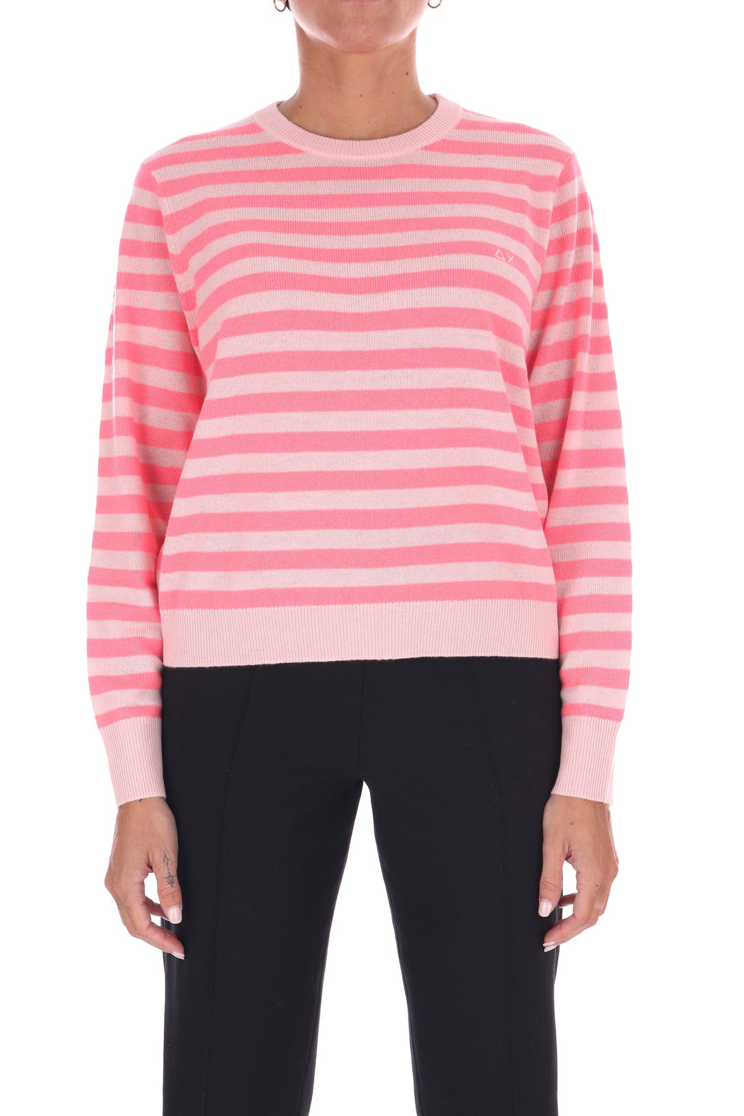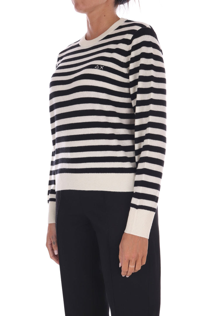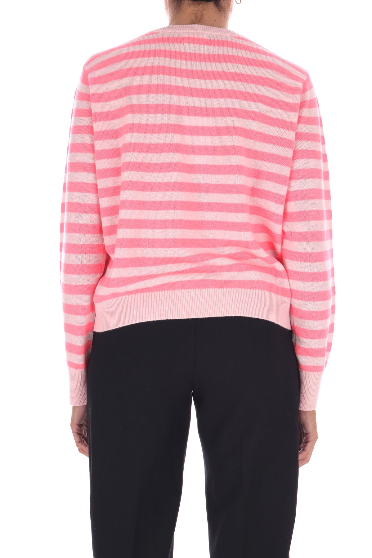 La maglia a righe bicolore in lana unisce uno stile fresco e vivace a una vestibilità a scatola comoda e moderna. Morbida e calda, è perfetta per chi desidera un capo versatile che valorizzi ogni outfit con un tocco di carattere e comfort quotidiano. La modella indossa una Tag S