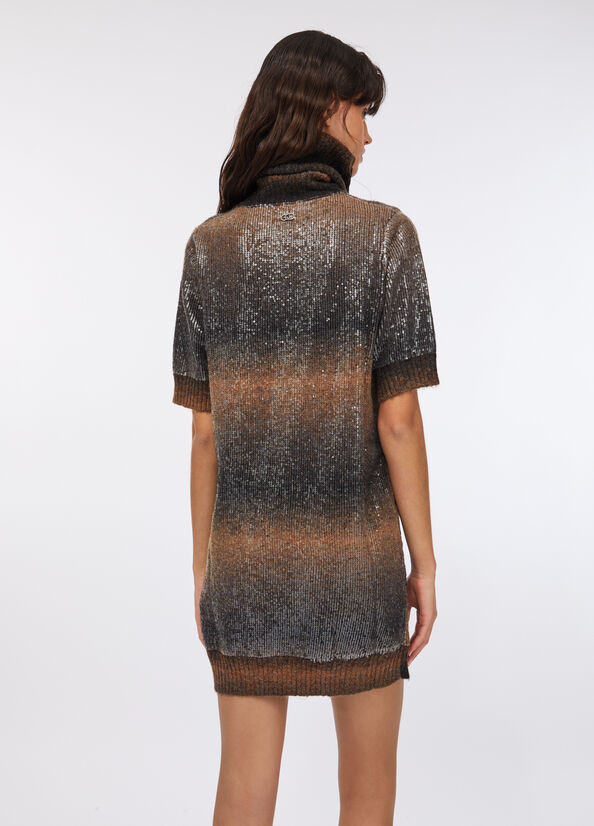 Abito corto che cattura lo sguardo con un'esplosione di paillettes all over su una base di pregiato misto lana. Il collo dolcevita avvolge con calore e eleganza, mentre le maniche corte mantengono una proporzione moderna e giocosa. I bordi a coste definiscono i contorni con precisione, creando una silhouette impeccabile. Un capo che non sceglie la discrezione: perfetto per chi vuole brillare e lasciare un'impronta indimenticabile.