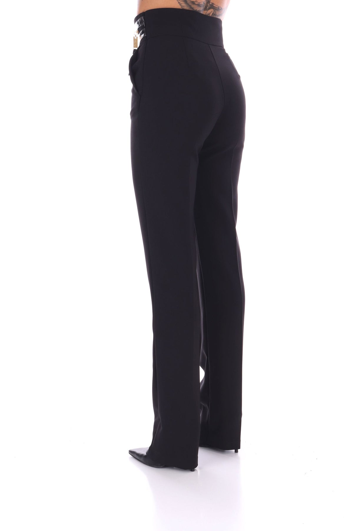 I pantaloni slim in crêpe leggero offrono una vestibilità elegante e confortevole. Il fascione a vita alta con texture in vernice craquelé crea un raffinato contrasto materico, valorizzato dalla zip in metallo dorato con tirazip, che aggiunge un tocco di lusso e dettaglio sofisticato. Ideali per un look moderno e sofisticato. La modella indossa una Tag 42 italiana