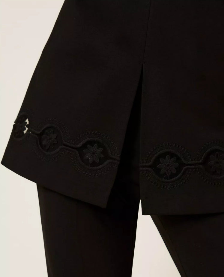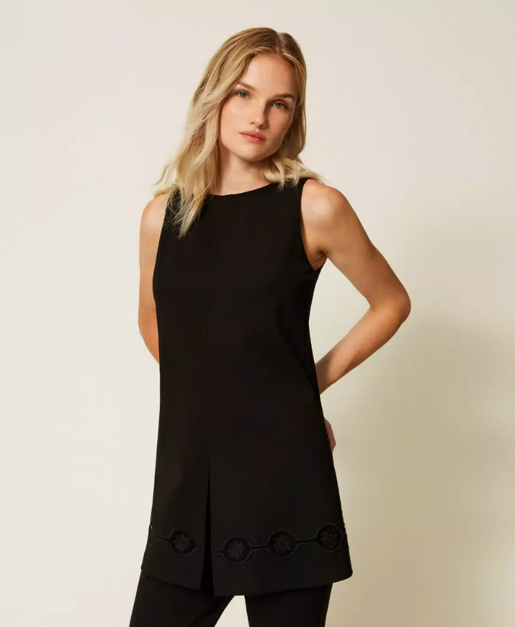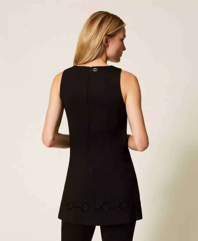 Sofisticata e sensuale, questa tunica in punto Milano seduce con un ricamo floreale traforato che emerge dal fondo come un segreto rivelato. Il collo tondo è puro e minimalista, mentre lo spacco davanti aggiunge movimento e libertà di gesto. La zip invisibile sul retro mantiene un'eleganza discreta, permettendo una vestibilità impeccabile. La linea slim e svasata abbraccia il corpo con grazia, creando una silhouette che gioca tra struttura e fluidità. Un capo che sussurra piuttosto che gridare, perfetto per chi sa che il vero coraggio sta nei dettagli nascosti. La modella indossa una Tag 42 italiana