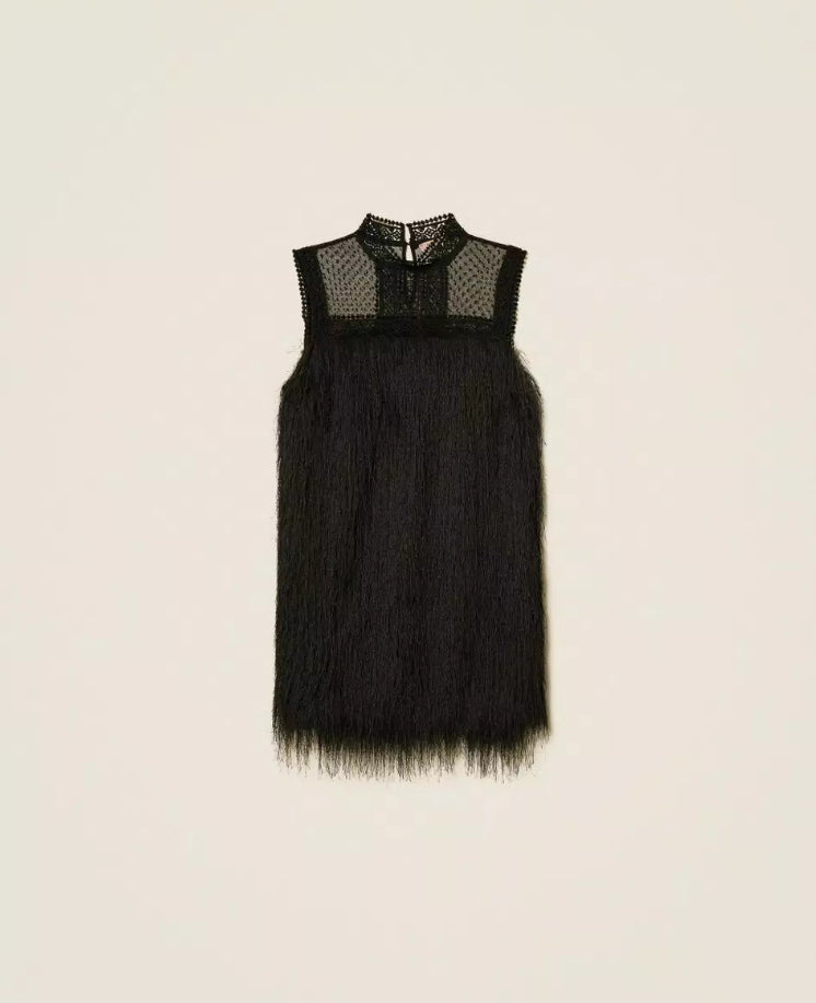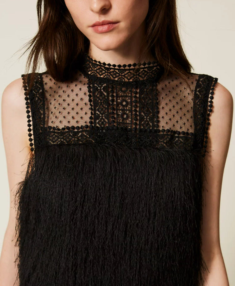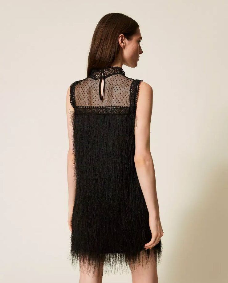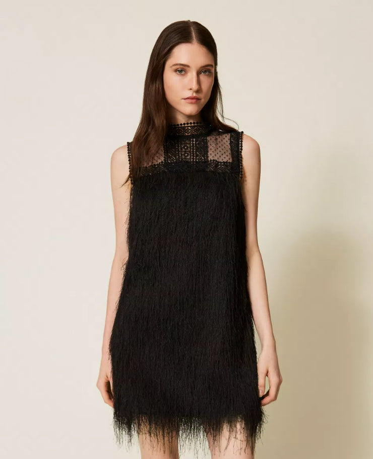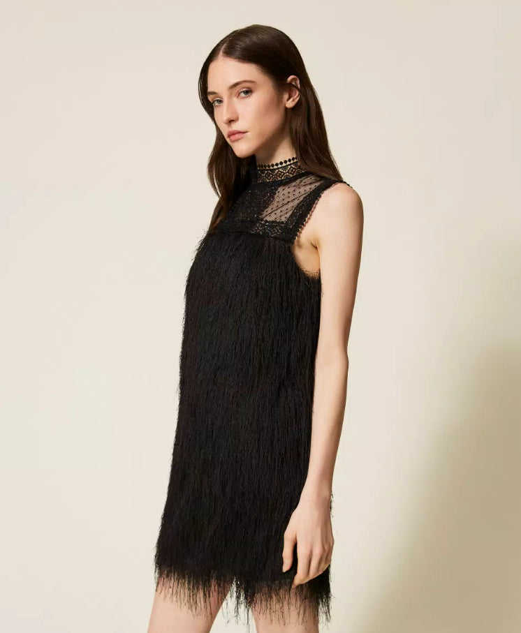 Un'esplosione di movimento e sensualità. Questo abito corto gioca con le frange che danzano ad ogni passo, mentre il carré in tulle plumetis aggiunge una dimensione onirica. Le passamanerie in pizzo applicate sui profili creano dettagli sofisticati che catturano lo sguardo. Senza maniche e con collo tondo, la silhouette è pura e moderna, resa ancora più intrigante dall'apertura a goccia sul retro. Una scelta coraggiosa per chi vuole brillare con stile inaspettato e magnetico. La modella indossa una Tag 42 italiana