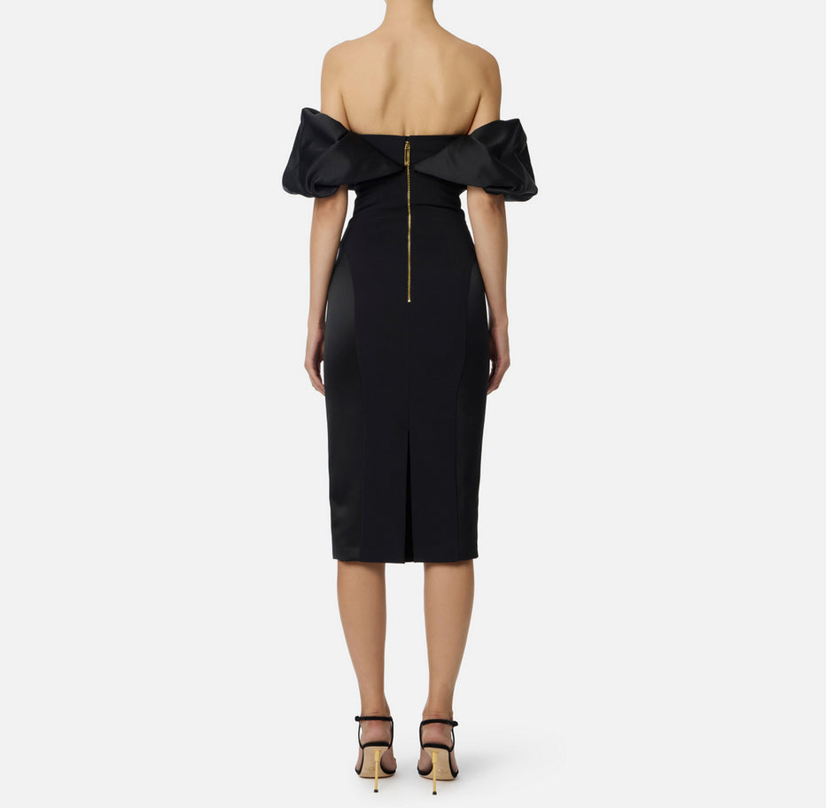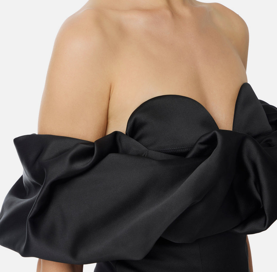 Abito tubino in duchesse dalla silhouette aderente che esalta le curve con sicurezza. Le spalle scoperte sono avvolte da uno scollo vaporoso con volumi 3D che evocano nuvole sospese, creando un contrasto affascinante tra struttura e leggerezza. Gli inserti in crêpe aggiungono definizione, mentre lo spacco posteriore regala movimento e libertà. Un capo che seduce attraverso l'equilibrio tra sensualità e sofisticazione, perfetto per chi non teme di osare con eleganza. La modella indossa una Tag 42 italiana