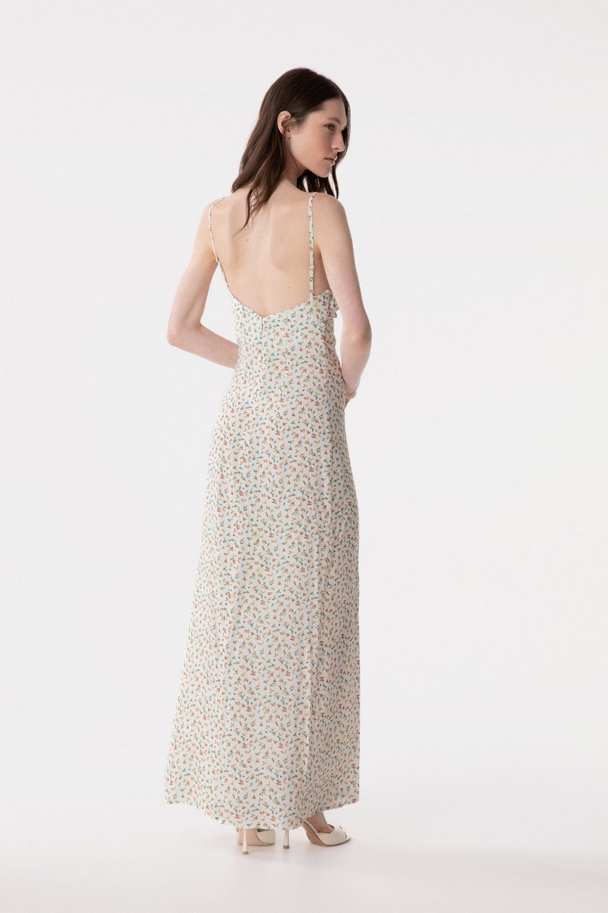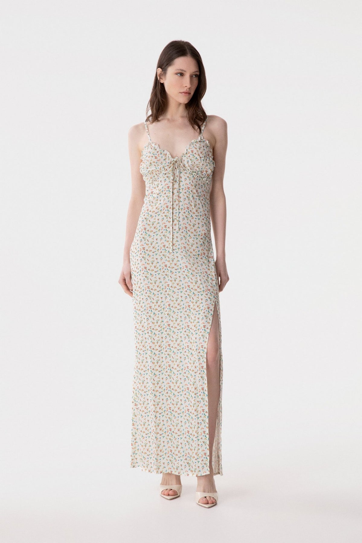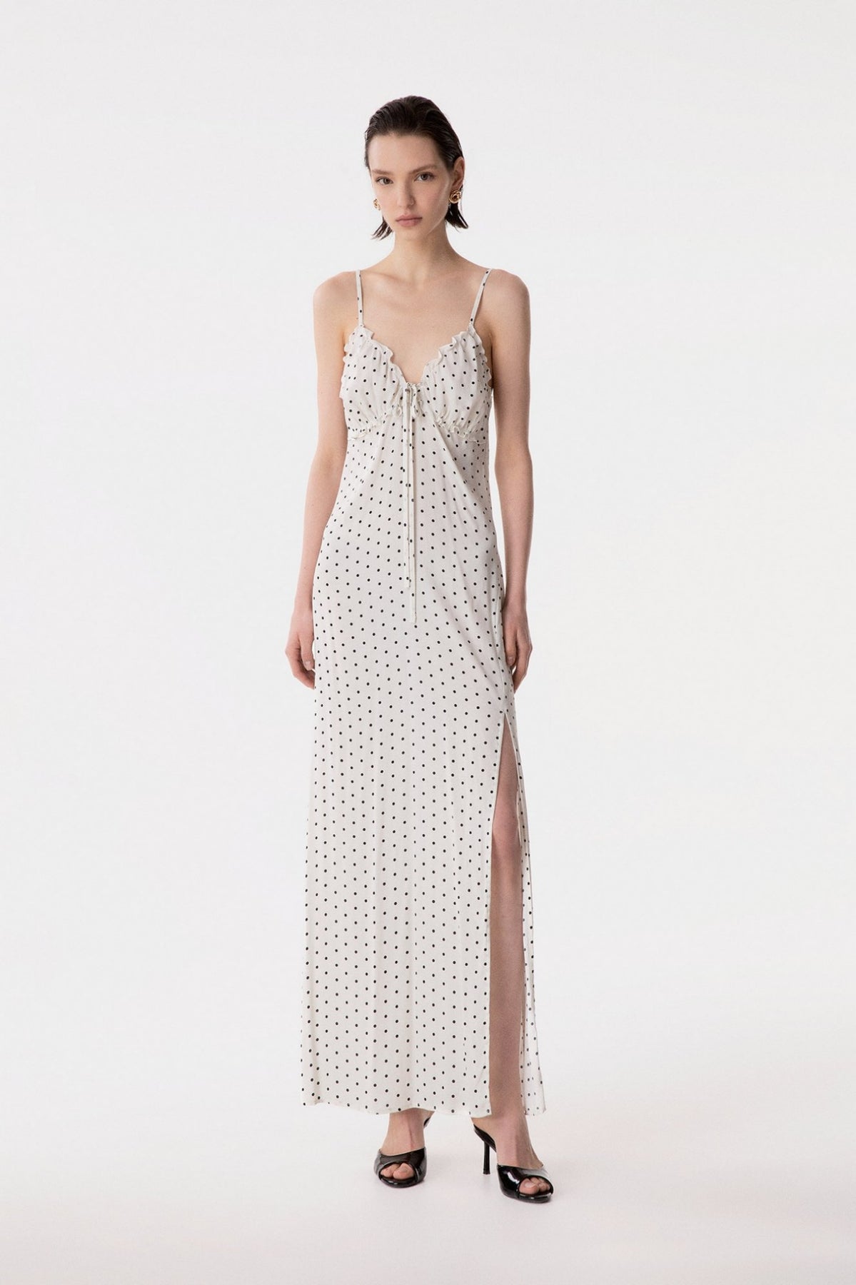 Riley - Abito Lungo Dritto In Crepe Con Arricciature Sul Seno Eleganza audace in pura forma. Questo abito lungo in crepe affascina con linee essenziali e dritte che esaltano la silhouette, mentre le arricciature strategiche sul seno aggiungono movimento e sensualità. Il tessuto fluido e sofisticato garantisce comfort durante tutta la giornata, perfetto per chi osa indossare stile con consapevolezza. Un capo versatile che passa senza sforzo da occasioni speciali a momenti di pura classe quotidiana. La modella indossa una Tag S Collezione P/E26