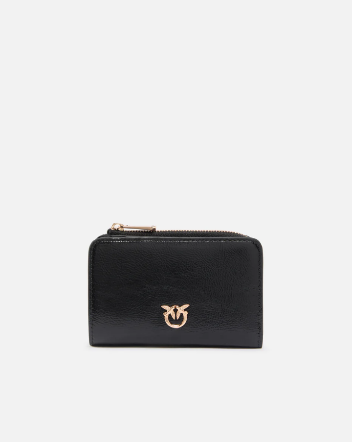 Portafoglio compatto che racchiude stile e funzionalità in dimensioni ridotte. La pelle shiny con effetto vintage conferisce carattere sofisticato, mentre l'interno ben organizzato offre vani dedicati per carte e documenti. Lo scomparto portamonete con zip garantisce sicurezza, e la placchetta in metallo con l'iconico logo Love Birds Diamond Cut firma il pezzo con eleganza. Il bottone interno mantiene la forma compatta, perfetto per borse minimal o clutch. Un accessorio audace che non scende a compromessi tra praticità e personalità.