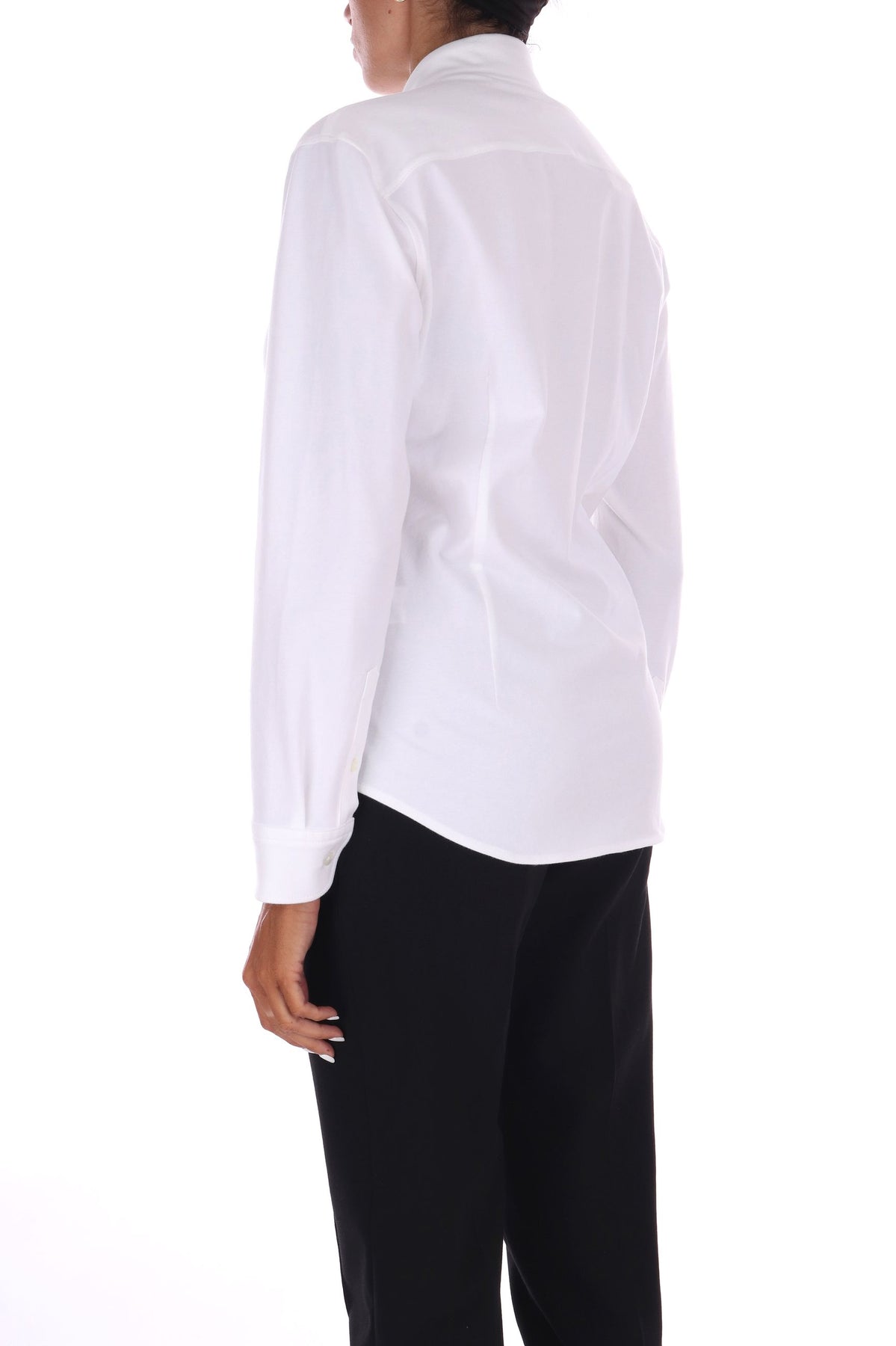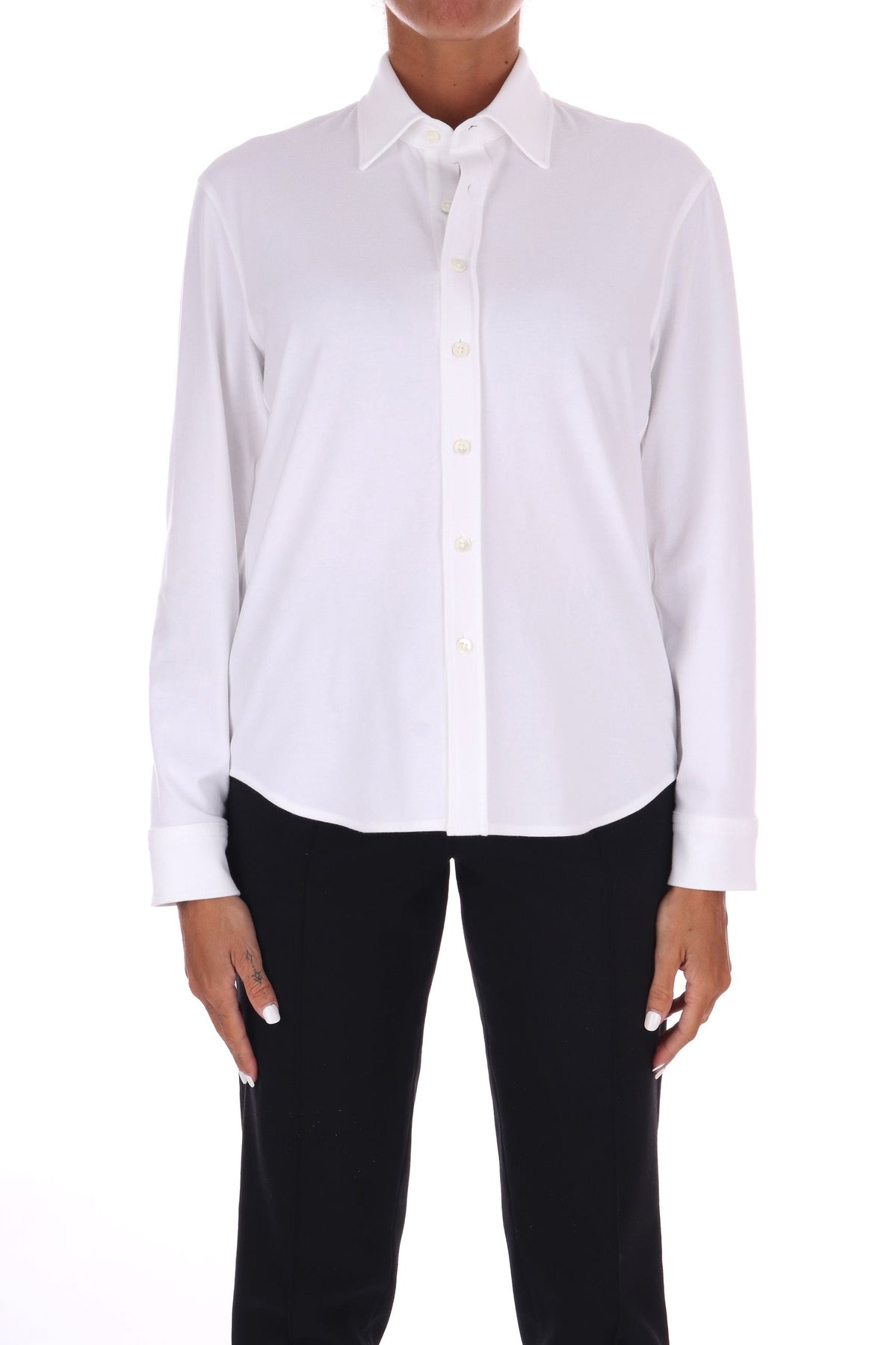 Questa camicia in jersey di cotone unisce comfort e stile grazie alla sua vestibilità fluida, che segue dolcemente le linee del corpo. L’abbottonatura centrale con bottoni in evidenza aggiunge un dettaglio distintivo, rendendo il capo perfetto per un look casual ma curato. La modella indossa una Tag 42 italiana