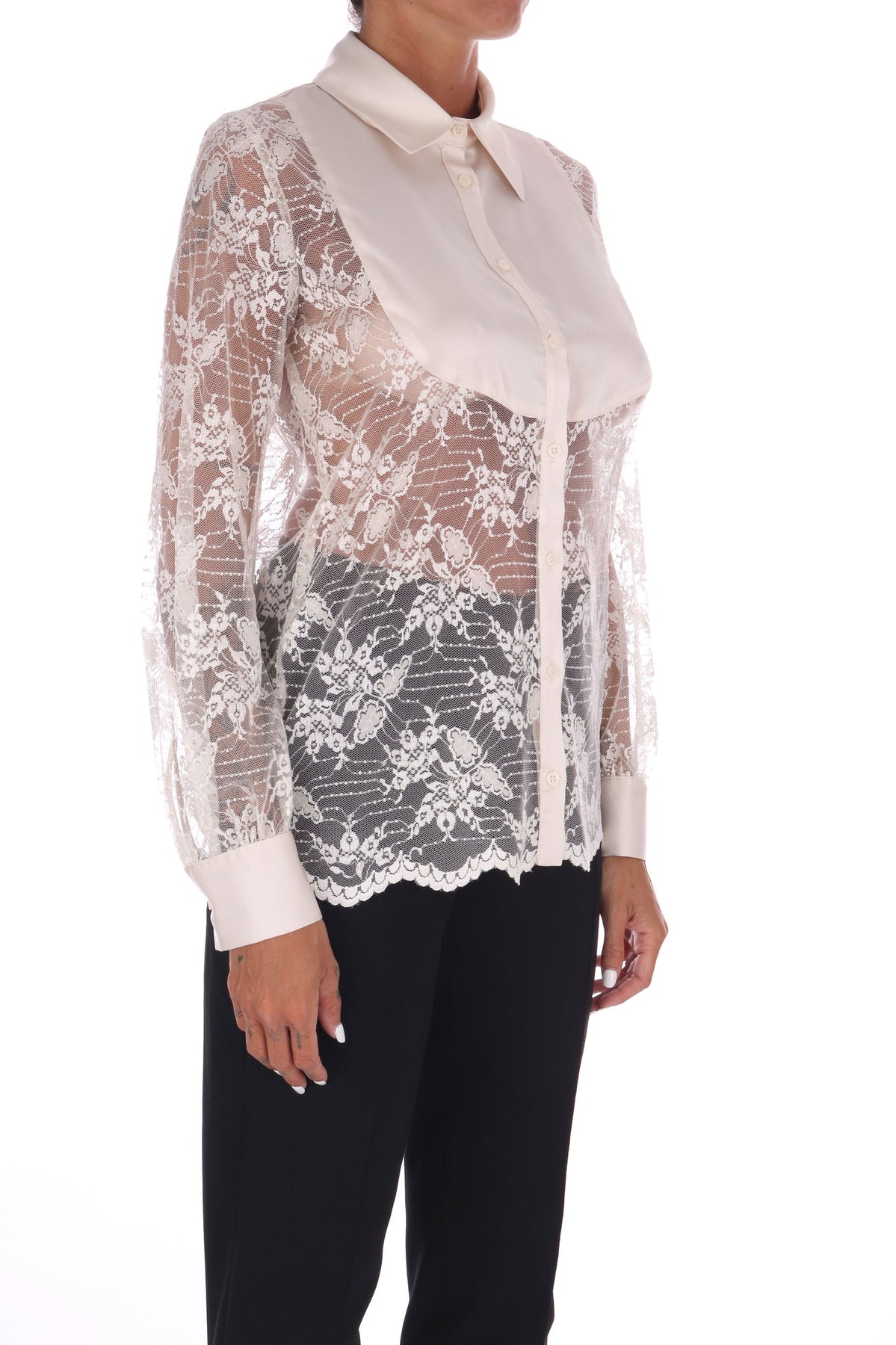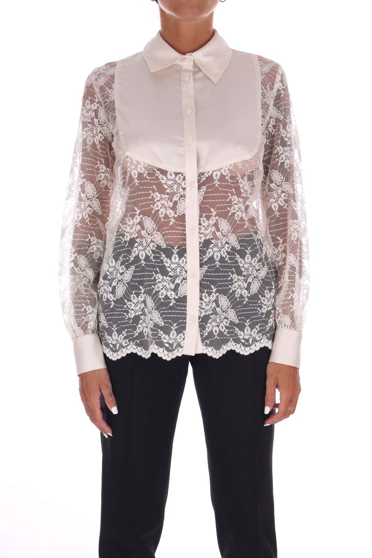 Camicia in tessuto combinato di pizzo e raso con chiusura centrale e bottoni visibili. La vestibilità regolare offre un equilibrio perfetto tra comfort e stile.