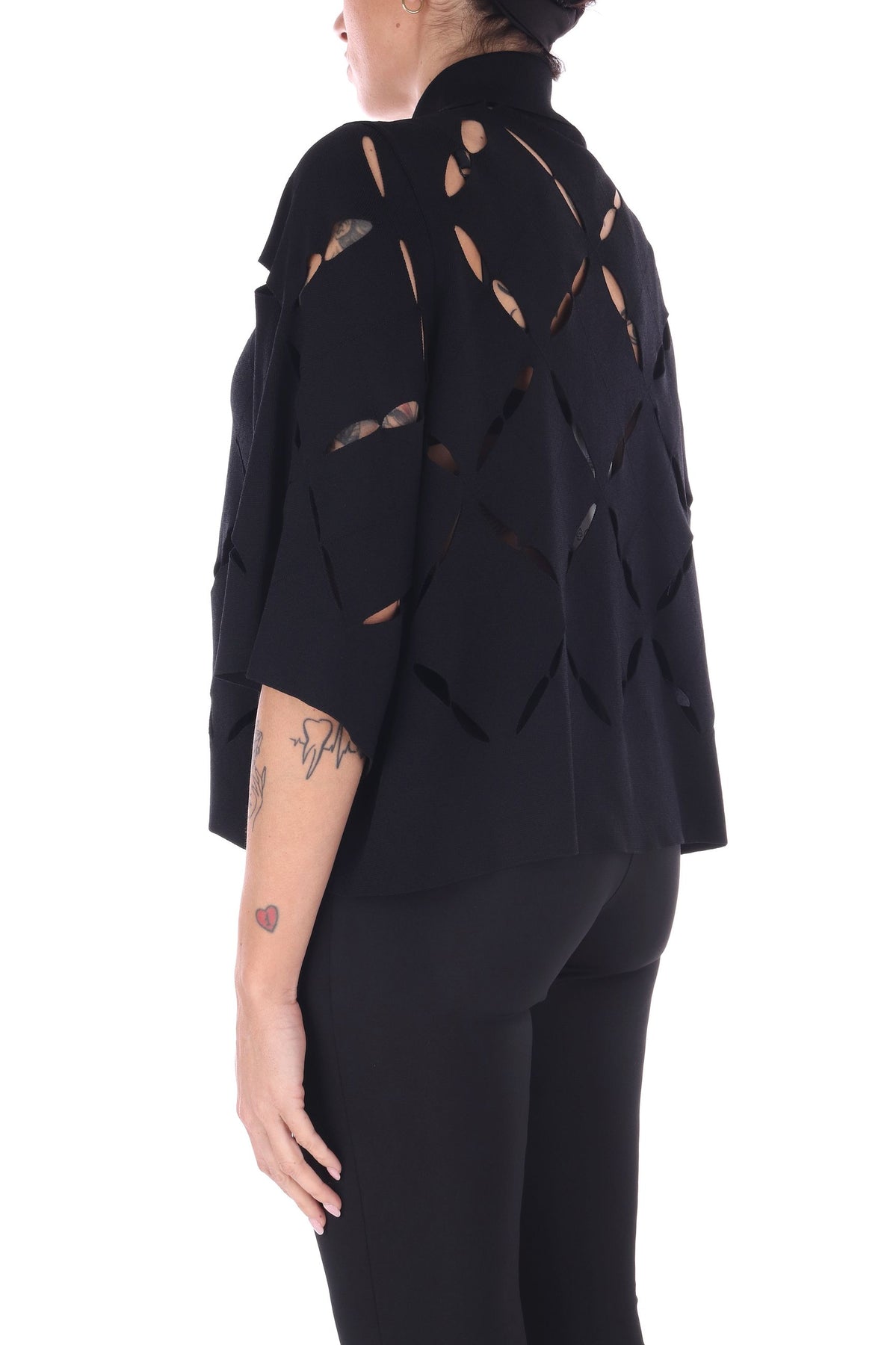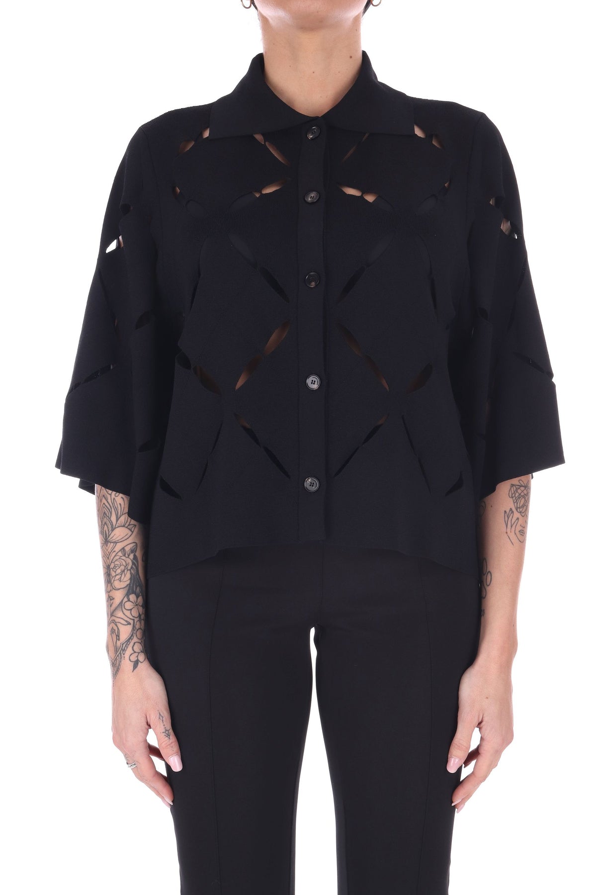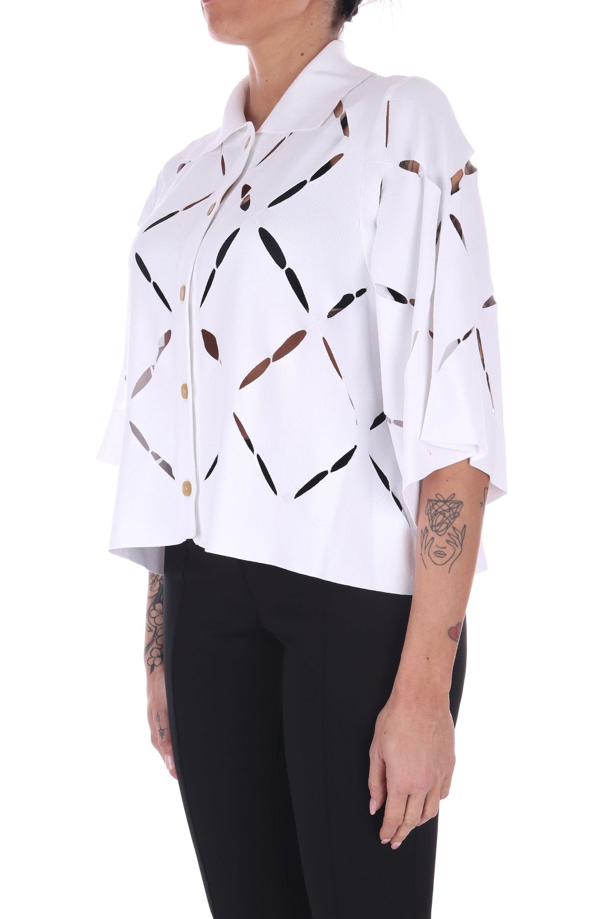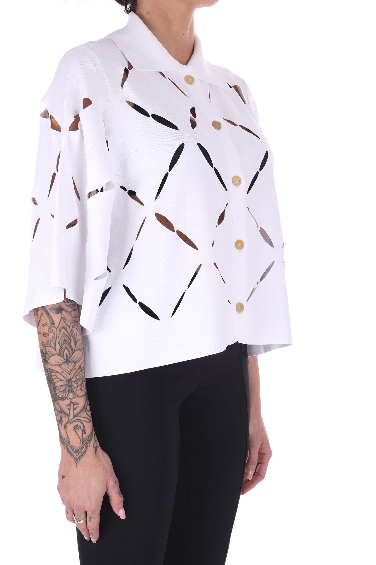 Cardigan in viscosa stretch che gioca con la luce attraverso rombi intagliati, creando un effetto visivo sofisticato e intrigante. Le maniche a tre quarti offrono eleganza senza rinunciare al comfort, mentre il colletto a polo aggiunge un tocco di carattere deciso. La chiusura centrale con asole e bottoni garantisce versatilità: indossalo completamente abbottonato per un look strutturato o lascialo aperto per un'allure più disinvolta. La linea morbida avvolge il corpo con grazia, perfetta per chi sa che il vero stile non ha fretta. La modella indossa una Tag S Collezione P/E26