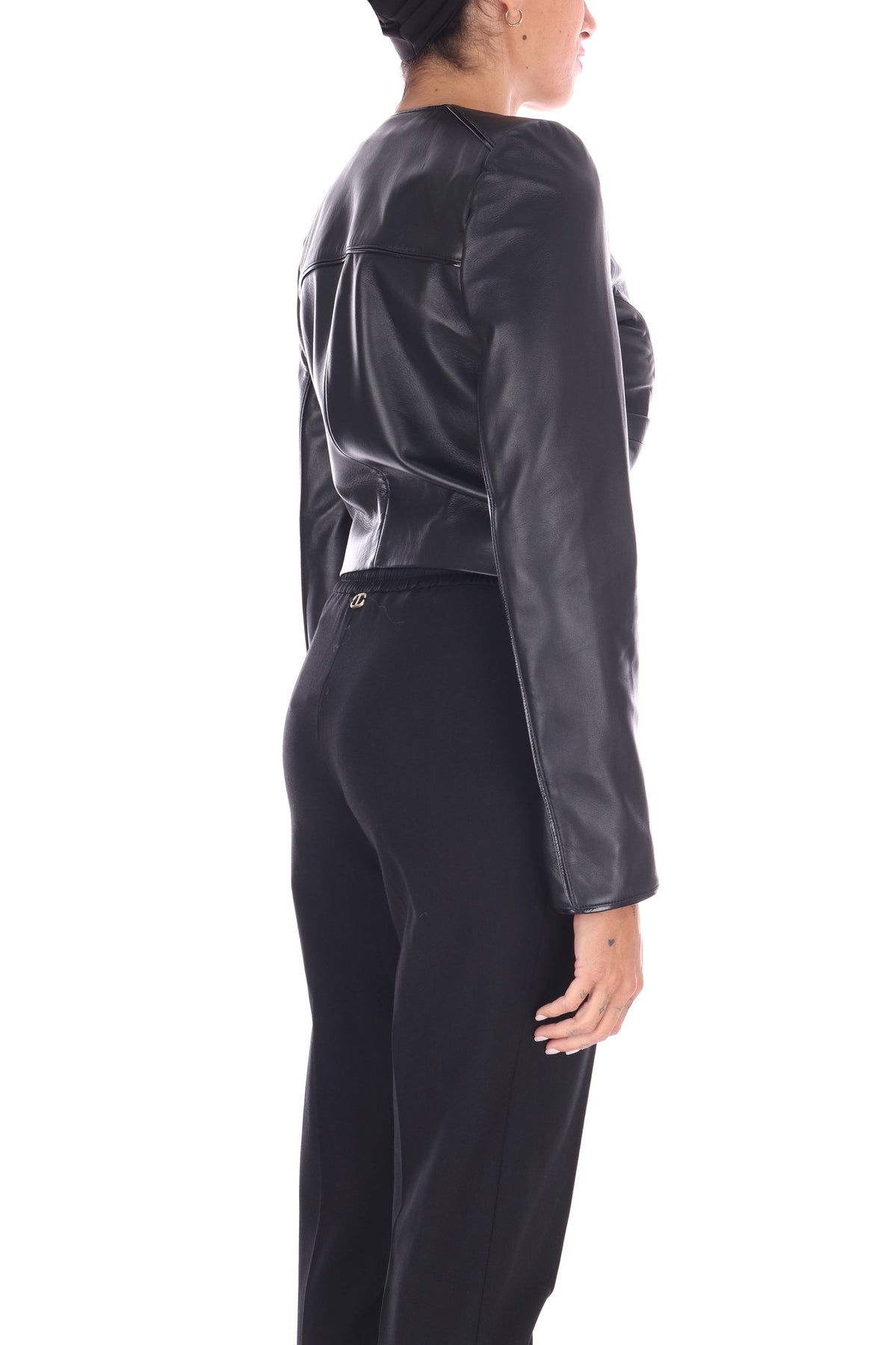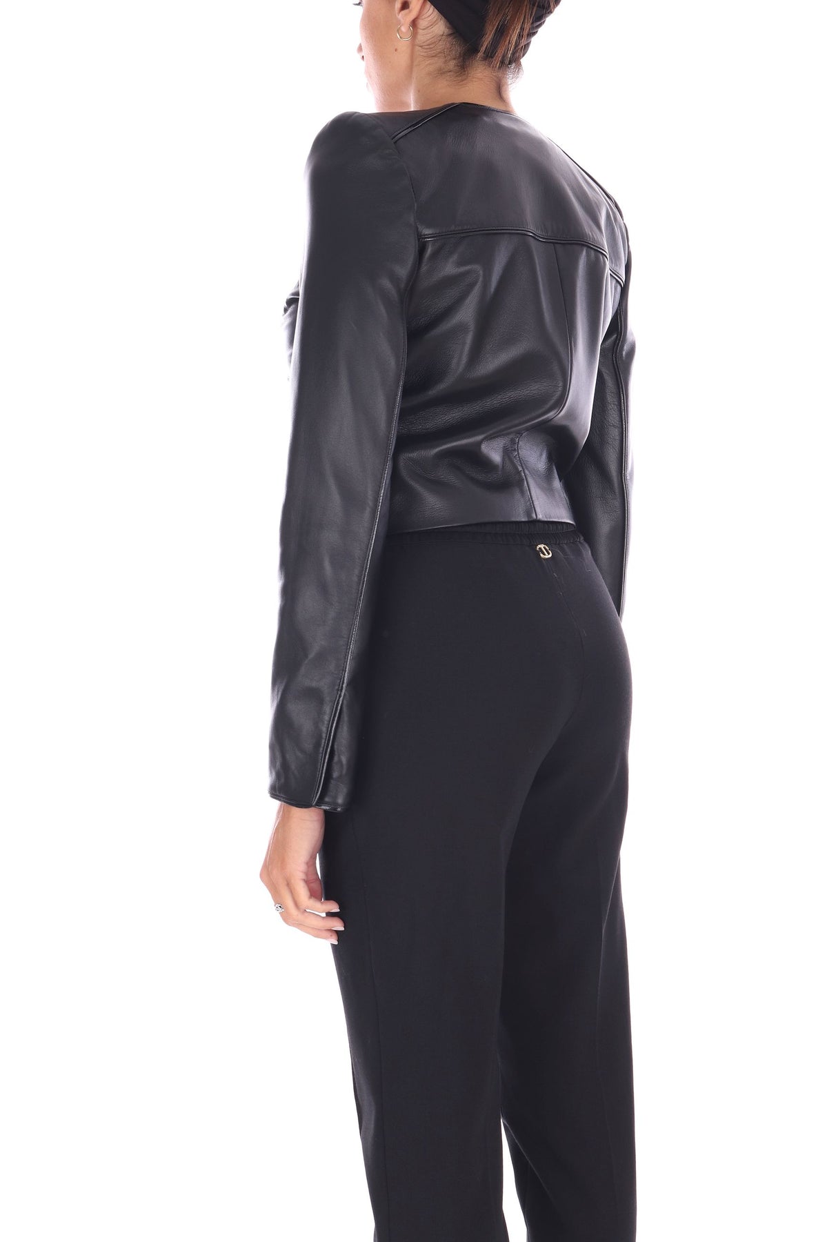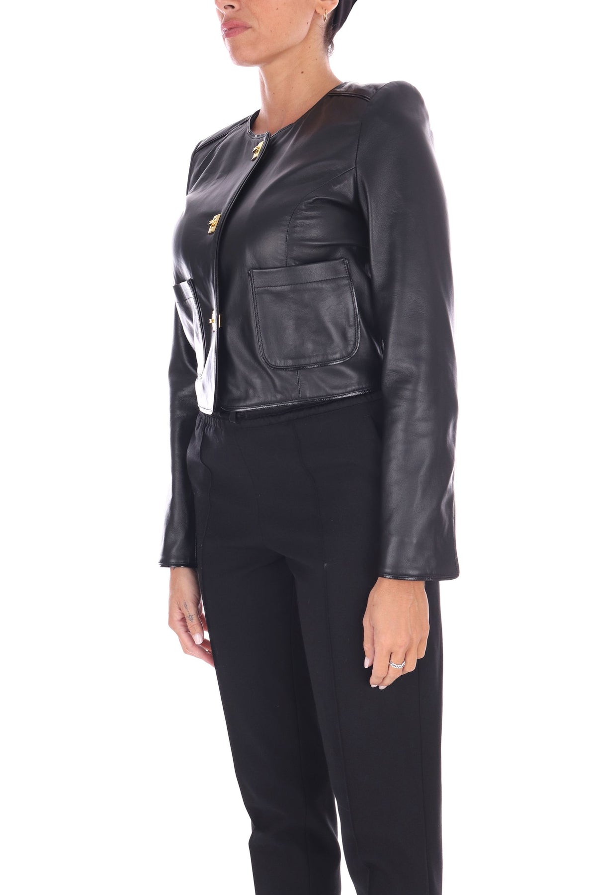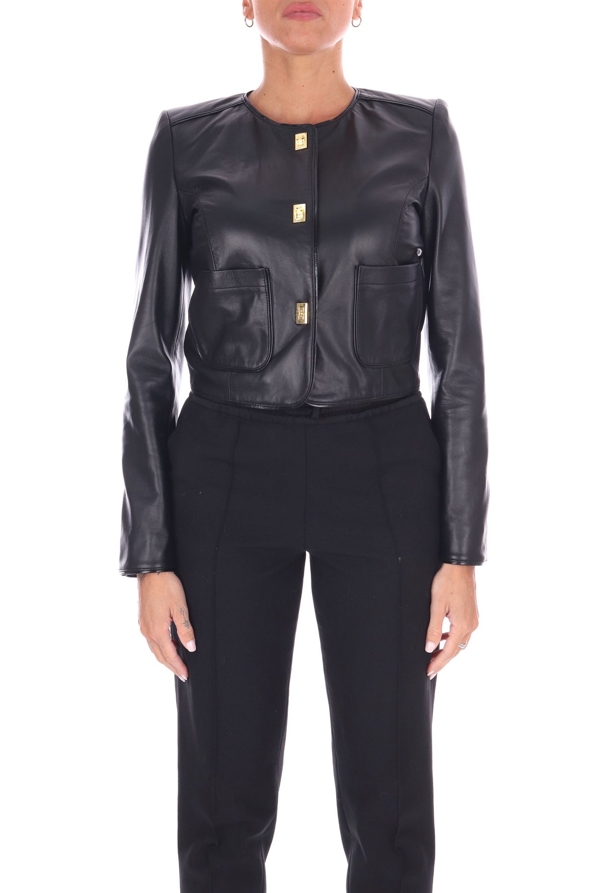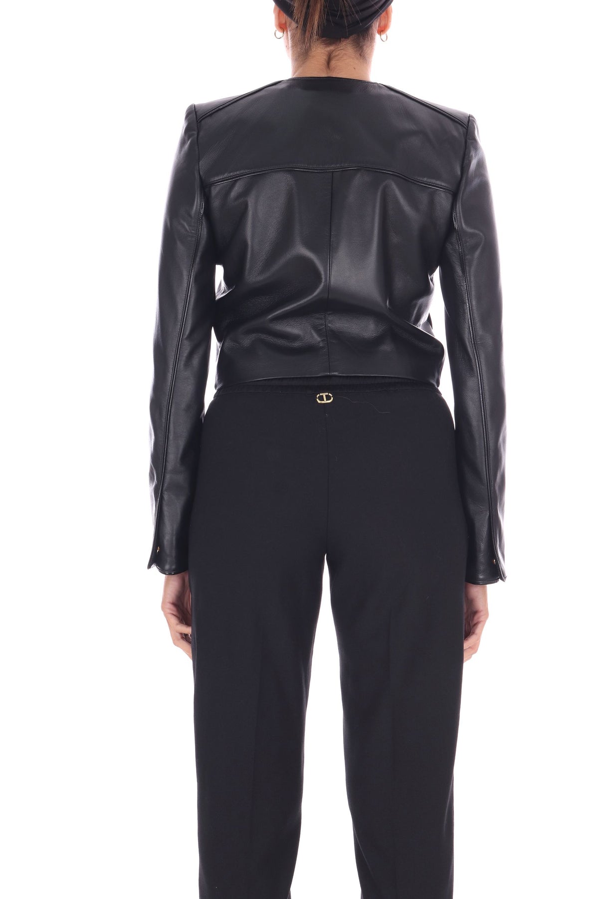 Giacca in pelle slim fit si distingue per il design elegante con scollo rotondo e maniche lunghe. Le tasche applicate aggiungono praticità, mentre i dettagli di piping in vinile e le chiusure a girello in metallo dorato donano un tocco sofisticato e luminoso. Un capo raffinato che valorizza ogni outfit con stile e personalità. La modella indossa una Tag 42 italiana