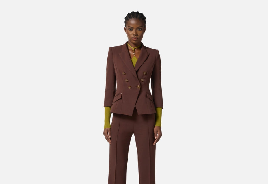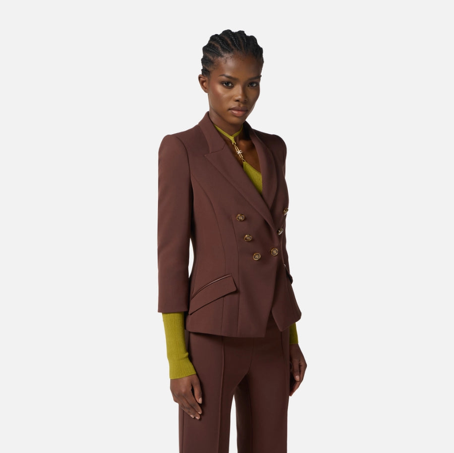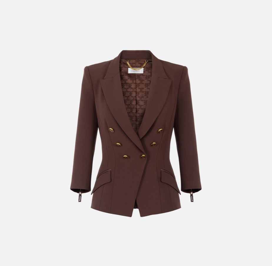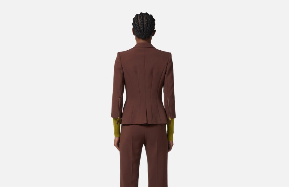 Sofisticazione con un'anima ribelle. Questa giacca in doppio crêpe abbraccia il corpo con una vestibilità slim che valorizza la silhouette, sostenuta da spalle strutturate decise. I rever a lancia conferiscono un'eleganza contemporanea, mentre le maniche ¾ rompono le convenzioni classiche. I dettagli audaci—zip funzionali al fondo manica e bottoni smaltati che catturano lo sguardo—trasformano un blazer essenziale in una dichiarazione di stile. Le patte con filetti in tono mantengono l'armonia estetica. Un capo versatile della collezione Essential, perfetto per chi vuole costruire un guardaroba senza compromessi tra tradizione e innovazione. La modella indossa una Tag 42 italiana