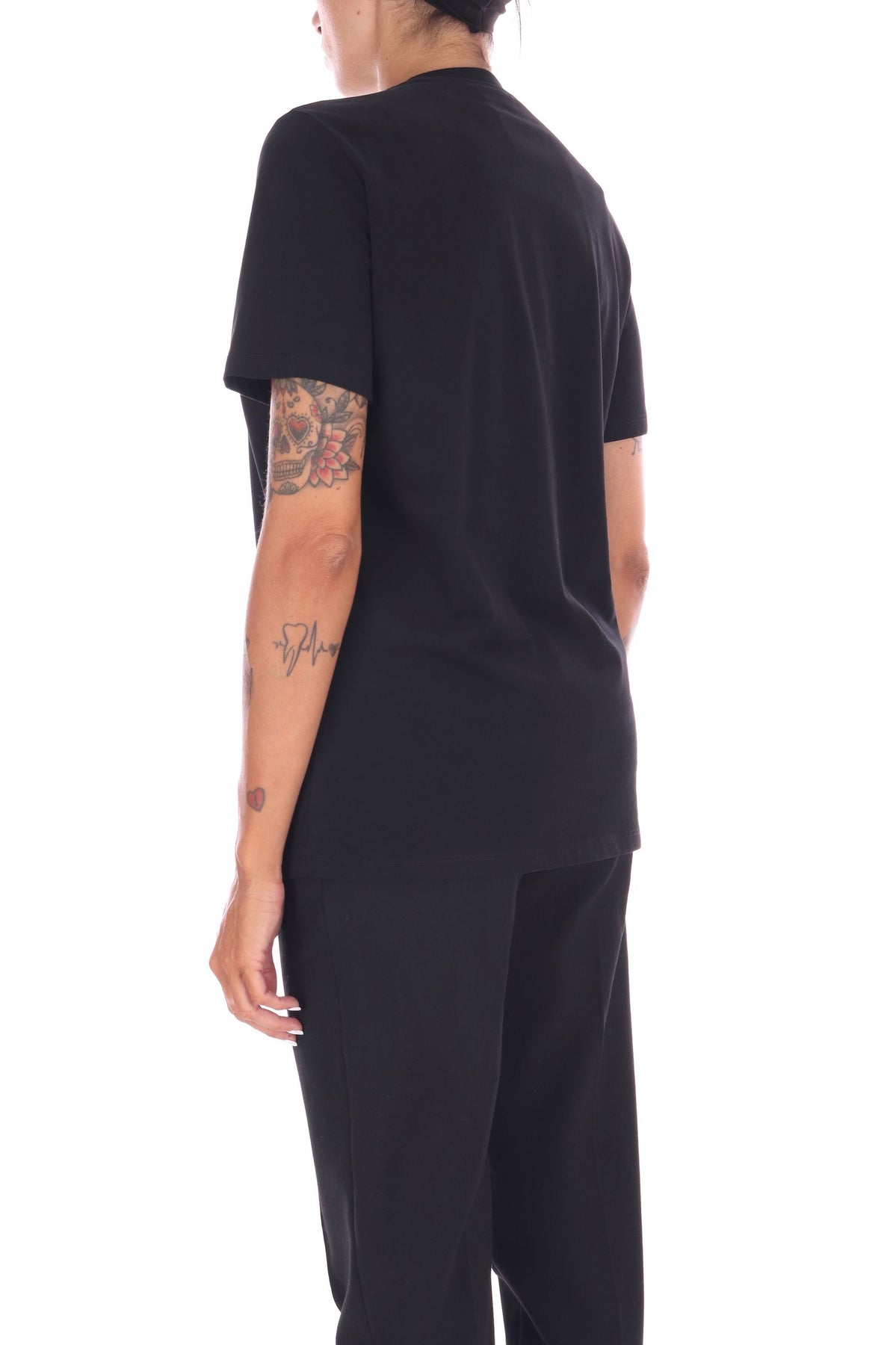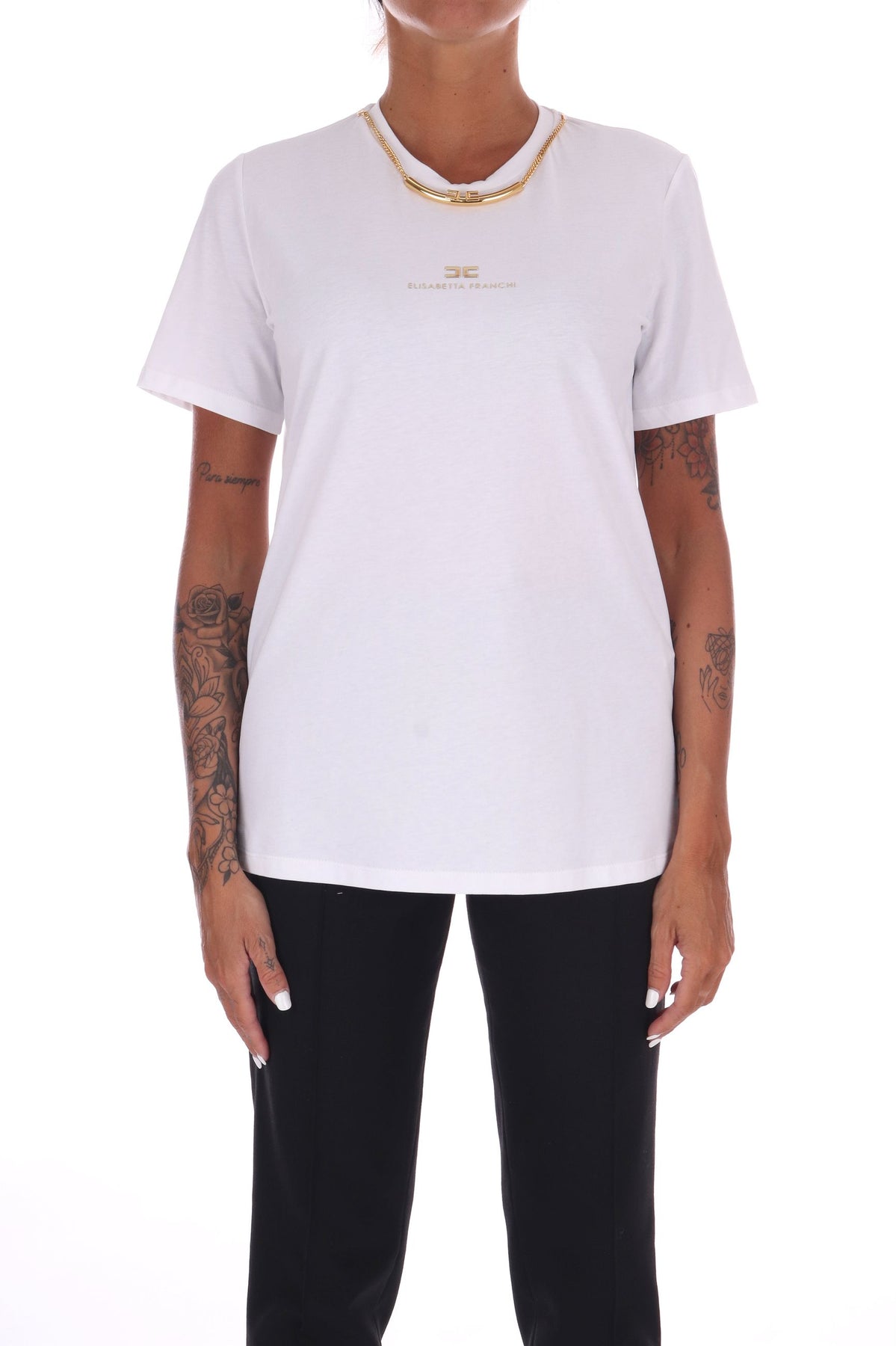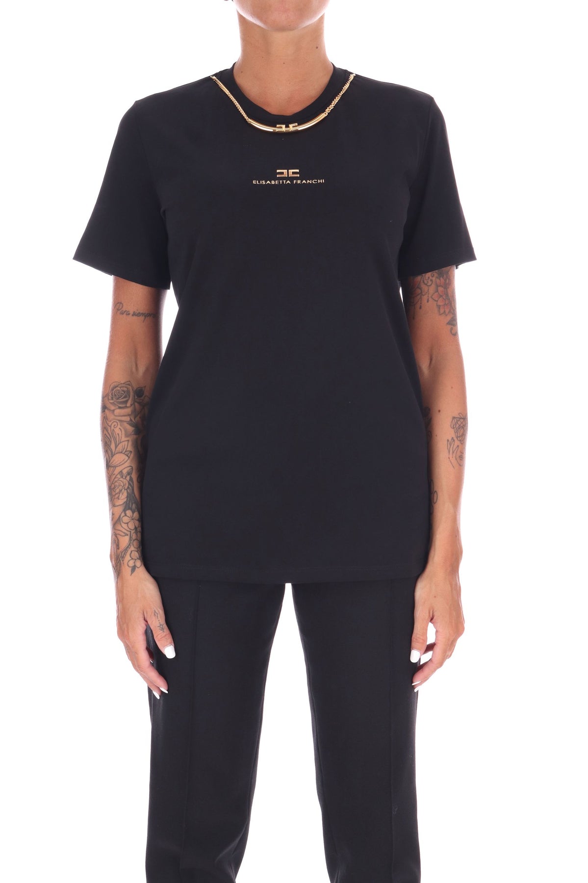 Questa maglietta a maniche corte in jersey di cotone unisce comfort e stile raffinato. La vestibilità regular garantisce una linea comoda, mentre la collana amovibile con catena, il logo centrale ed elementi tubolari in metallo dorato arricchiscono il design con dettagli luminosi. Il logo a rilievo aggiunge un tocco finale di eleganza, trasformando un capo semplice in un elemento distintivo del guardaroba. La modella indossa una Tag 42 italiana