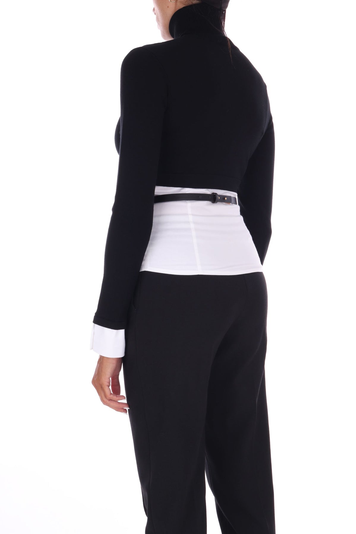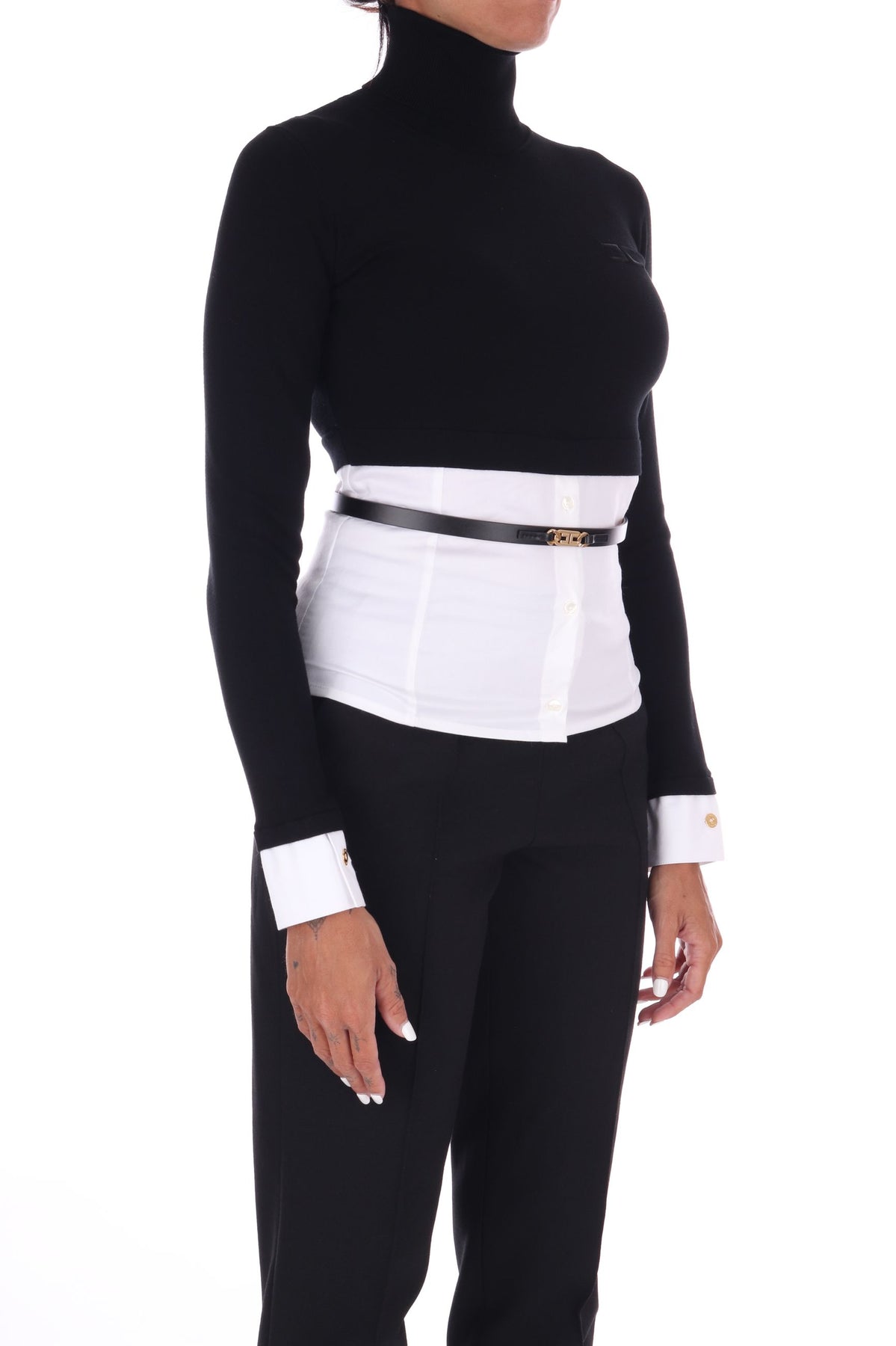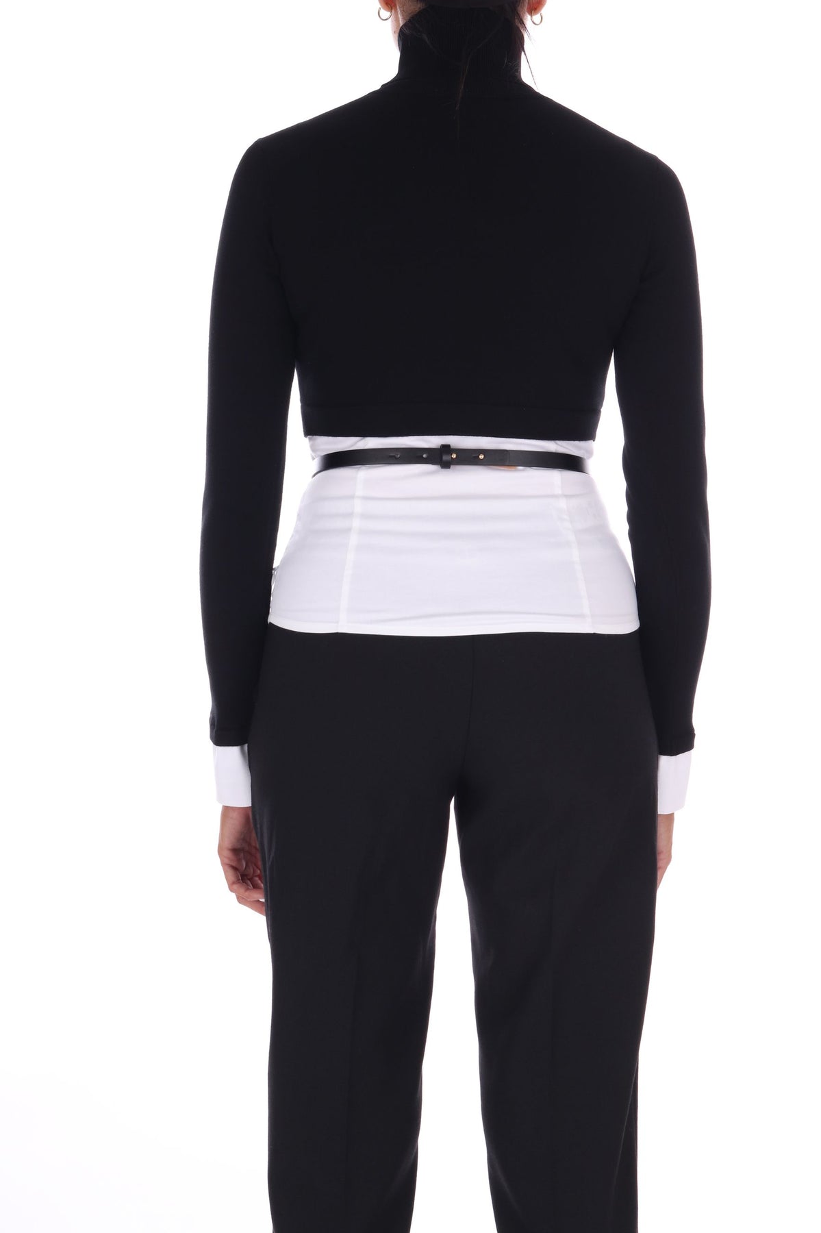 Maglia in viscosa che combina eleganza e design funzionale, con un fondo in popeline di cotone che richiama l’effetto camicia. Il collo dolcevita e le maniche lunghe con polsini donano un tocco raffinato, mentre il logo ricamato su un lato aggiunge esclusività. La cintura con logo crea un contrasto studiato che valorizza la silhouette aderente, rendendo questo capo perfetto per un look sofisticato e contemporaneo. La modella indossa una Tag 42 italiana