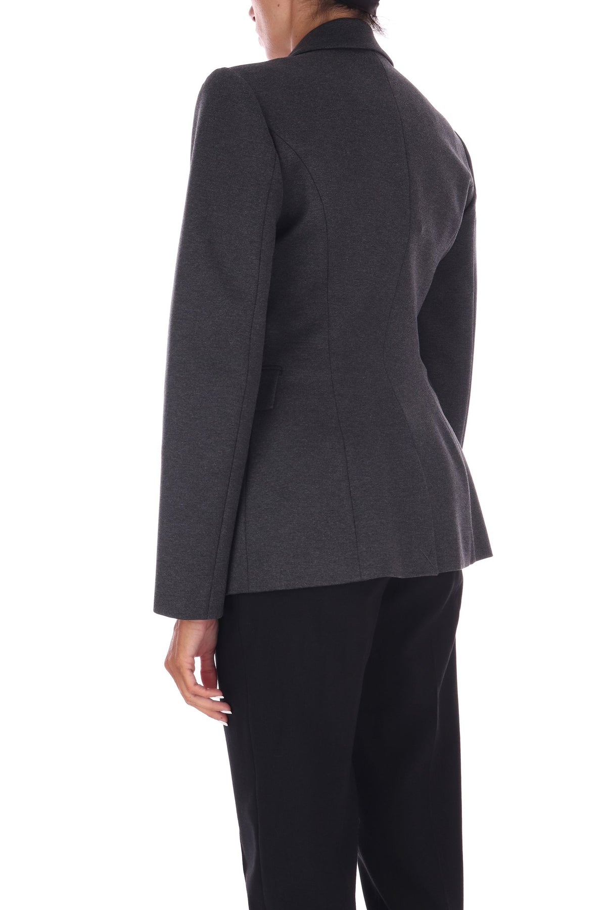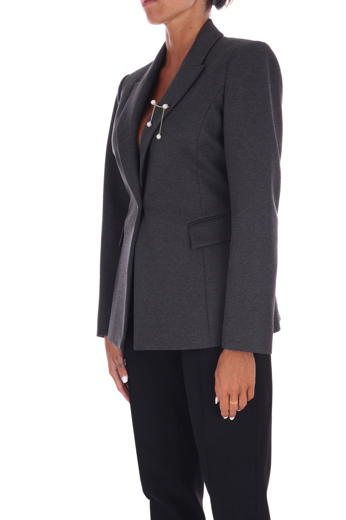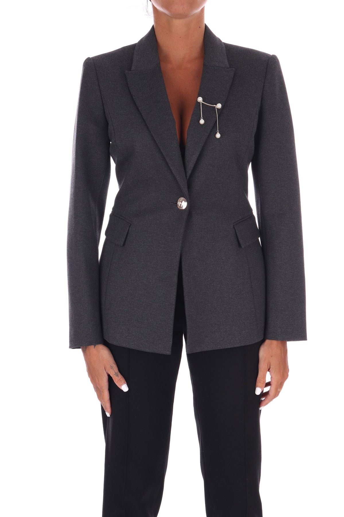 Questo blazer in jersey mélange punto milano coniuga struttura e morbidezza, garantendo una vestibilità che mantiene la sua forma nel tempo. Il rever classico e le tasche con patta aggiungono eleganza, mentre lo spacchetto sul dietro assicura comfort nei movimenti. La chiusura con bottone logato dona un tocco distintivo, completato dalla spilla gioiello removibile per personalizzare il look con raffinatezza. Un capo versatile e duraturo, ideale per chi cerca stile e funzionalità.