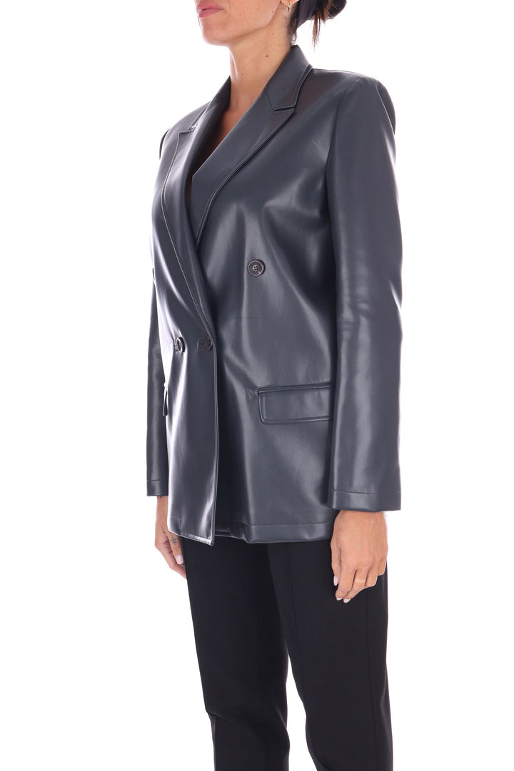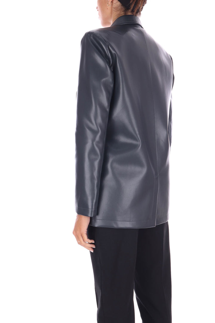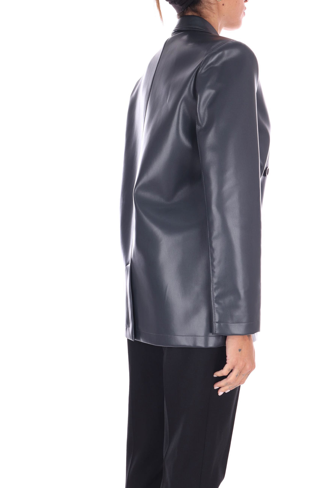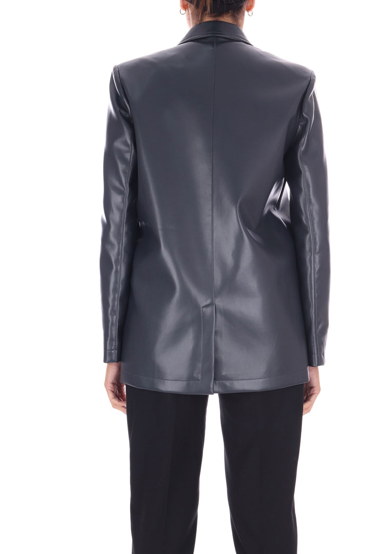 La giacca doppiopetto in eco pelle combina stile deciso e sostenibilità. Il taglio moderno è valorizzato dallo spacco centrale sul retro, che assicura libertà di movimento e un tocco di eleganza dinamica. Le patte applicate aggiungono dettagli distintivi e pratici, rendendo questo capo versatile per ogni occasione. Unisce design contemporaneo e rispetto per l’ambiente, perfetta per chi vuole farsi notare con consapevolezza. La modella indossa una Tag 42 Italiana