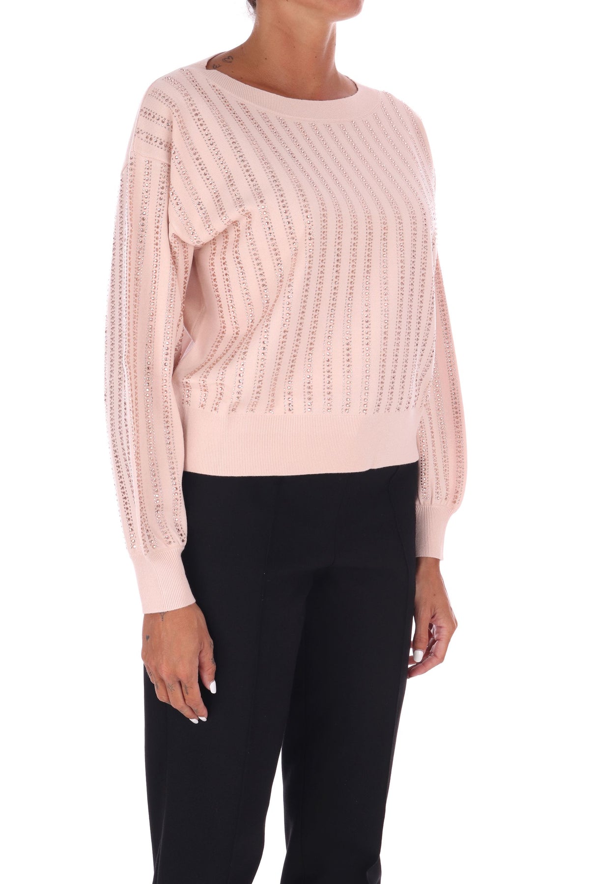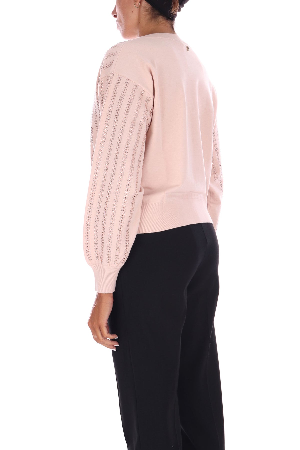 Regala un tocco di brillantezza al tuo guardaroba con questa maglia in misto viscosa! Lo scollo a barca e le maniche lunghe a palloncino creano una silhouette giocosa e femminile, mentre gli strass applicati aggiungono scintille di luce. I bordi a costine garantiscono comfort e vestibilità, e il logo LJ in metallo impreziosito da strass completa il look con un dettaglio chic e divertente. La modella indossa una Tag S