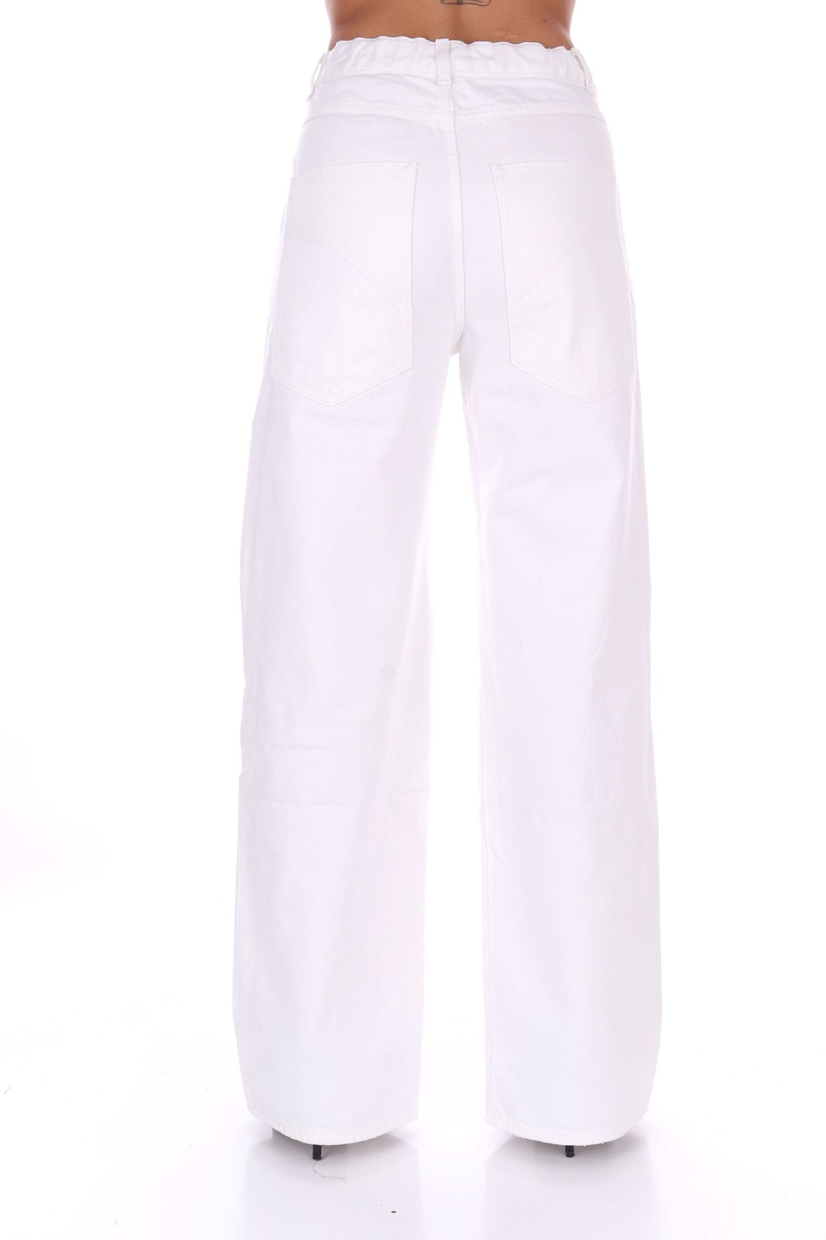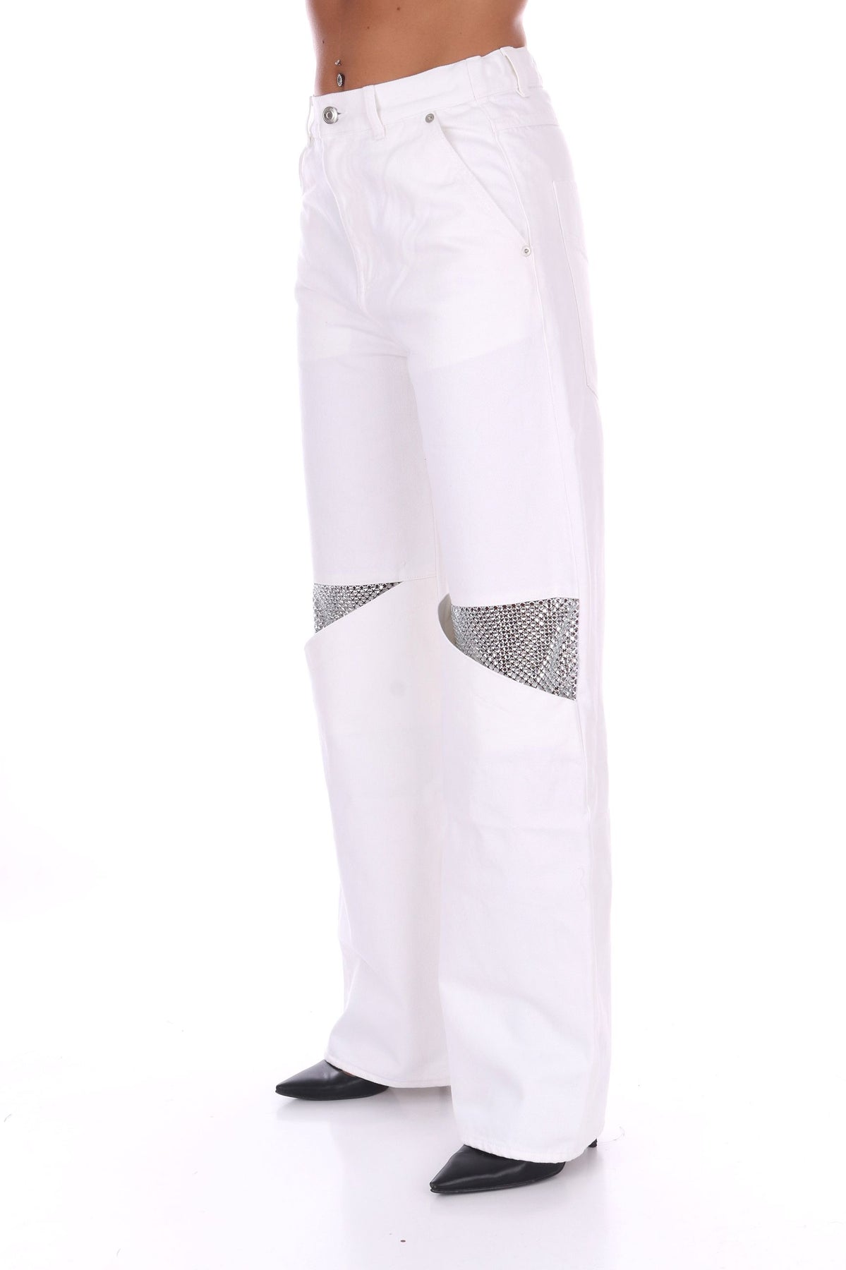 Pantaloni denim audaci con gamba ampia che cattura lo sguardo. La vita media offre una vestibilità confortevole e lusinghiera, mentre il dettaglio ginocchiera con rete strass aggiunge un tocco di glamour ribelle. Perfetti per chi non teme di osare e vuole fare un'affermazione di stile. Un capo che trasforma il denim classico in una dichiarazione di moda contemporanea e sfrontata. La modella indossa una Tag 40 italiana