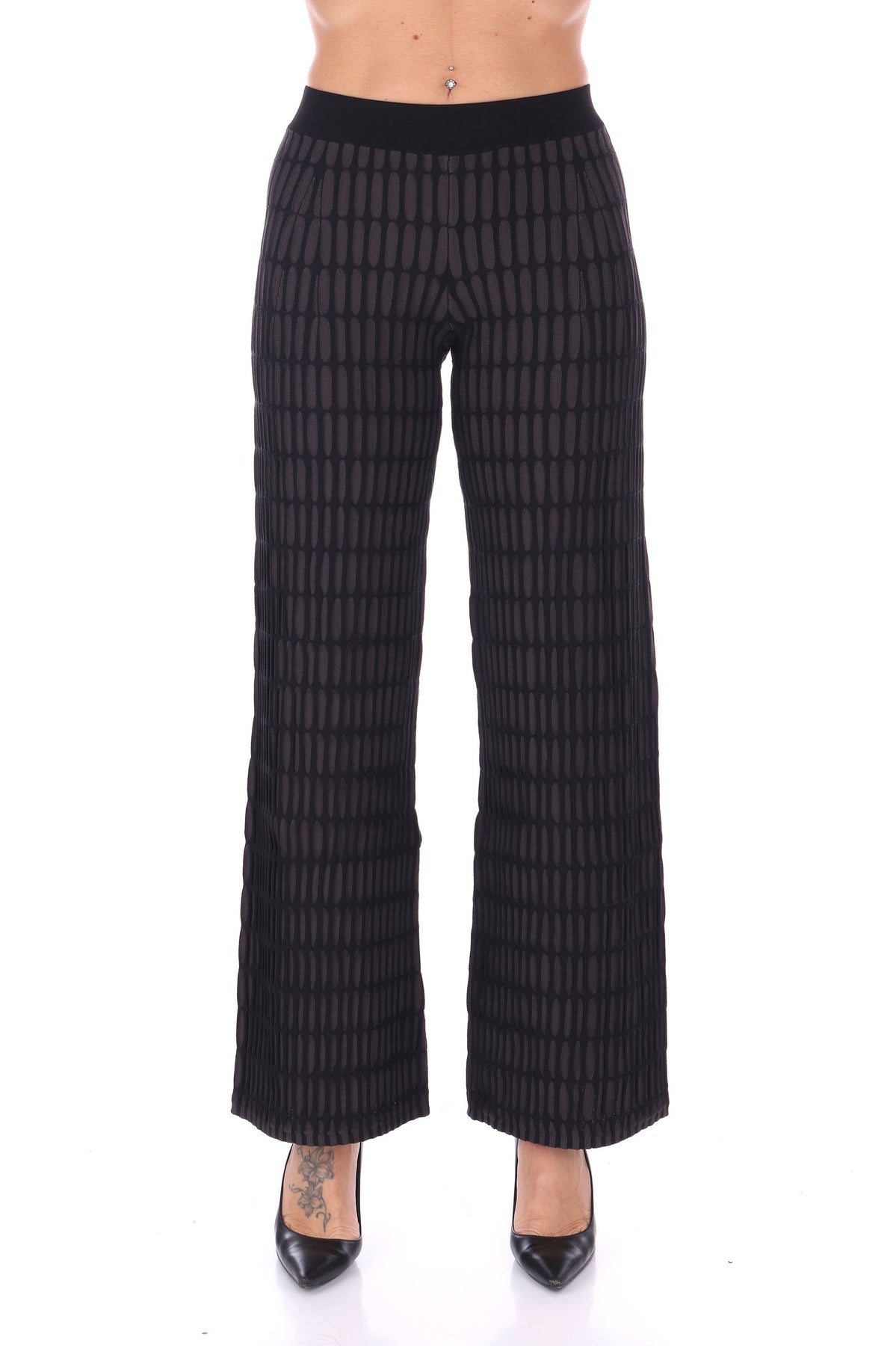 Pantaloni palazzo che sfidano la monotonia con un motivo geometrico bicolore a rilievo che cattura lo sguardo. Realizzati in viscosa stretch, garantiscono comfort e movimento senza compromessi. Il fascione con bordatura in tinta unita completa il design con eleganza sobria, creando un contrasto affascinante tra audacia e raffinatezza. Un capo che invita a camminare con consapevolezza, perfetto per chi sa che lo stile vero nasce dall'equilibrio tra dettagli sorprendenti e proporzioni impeccabili. La modella indossa una Tag XS Collezione P/E26