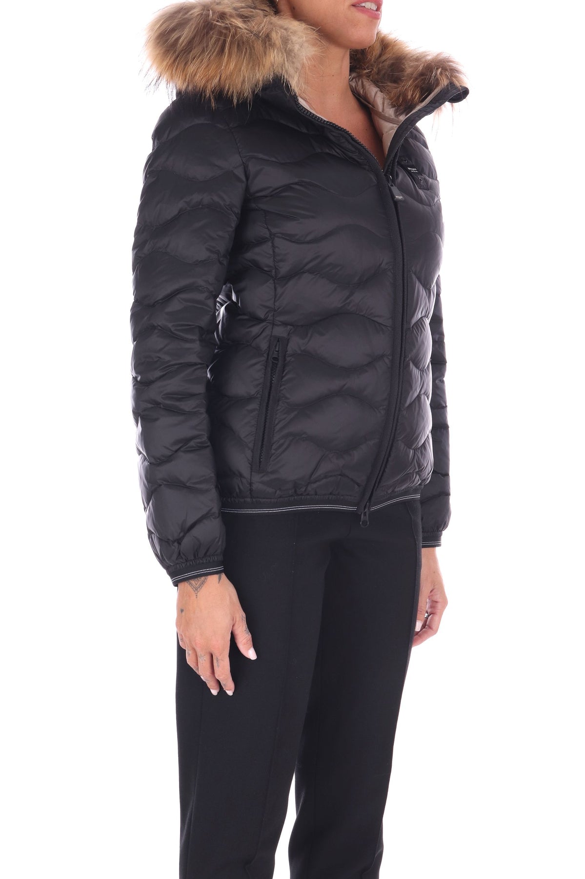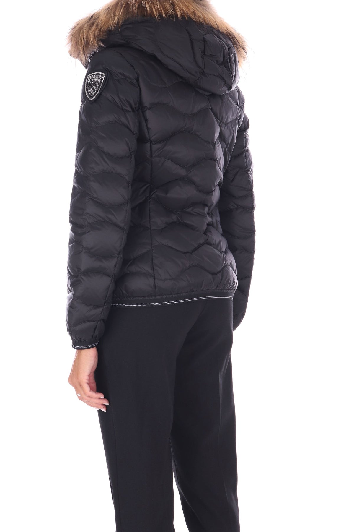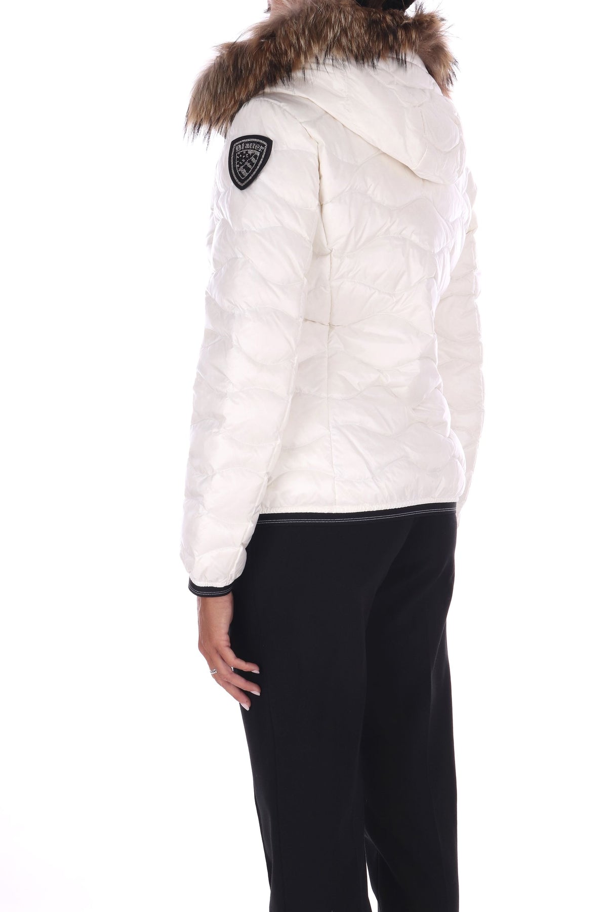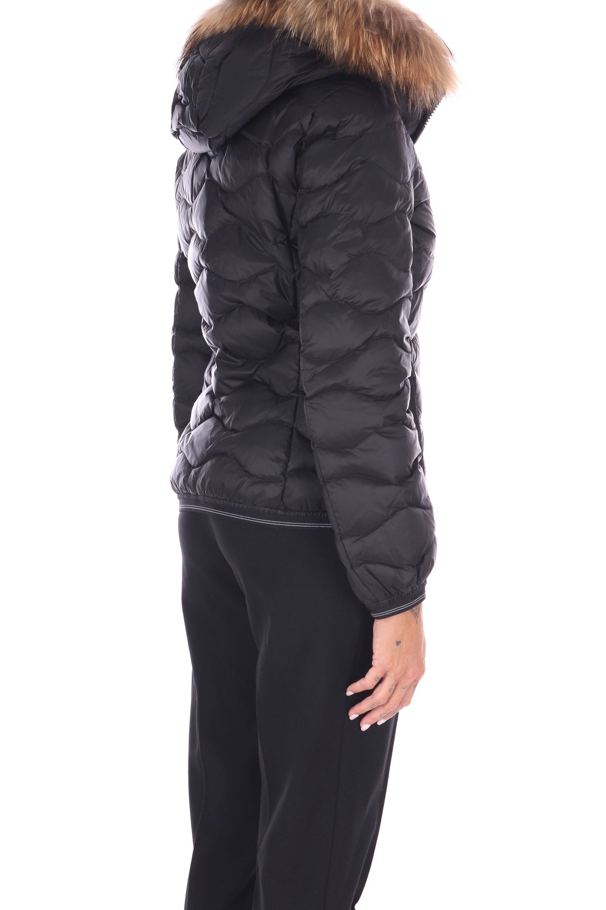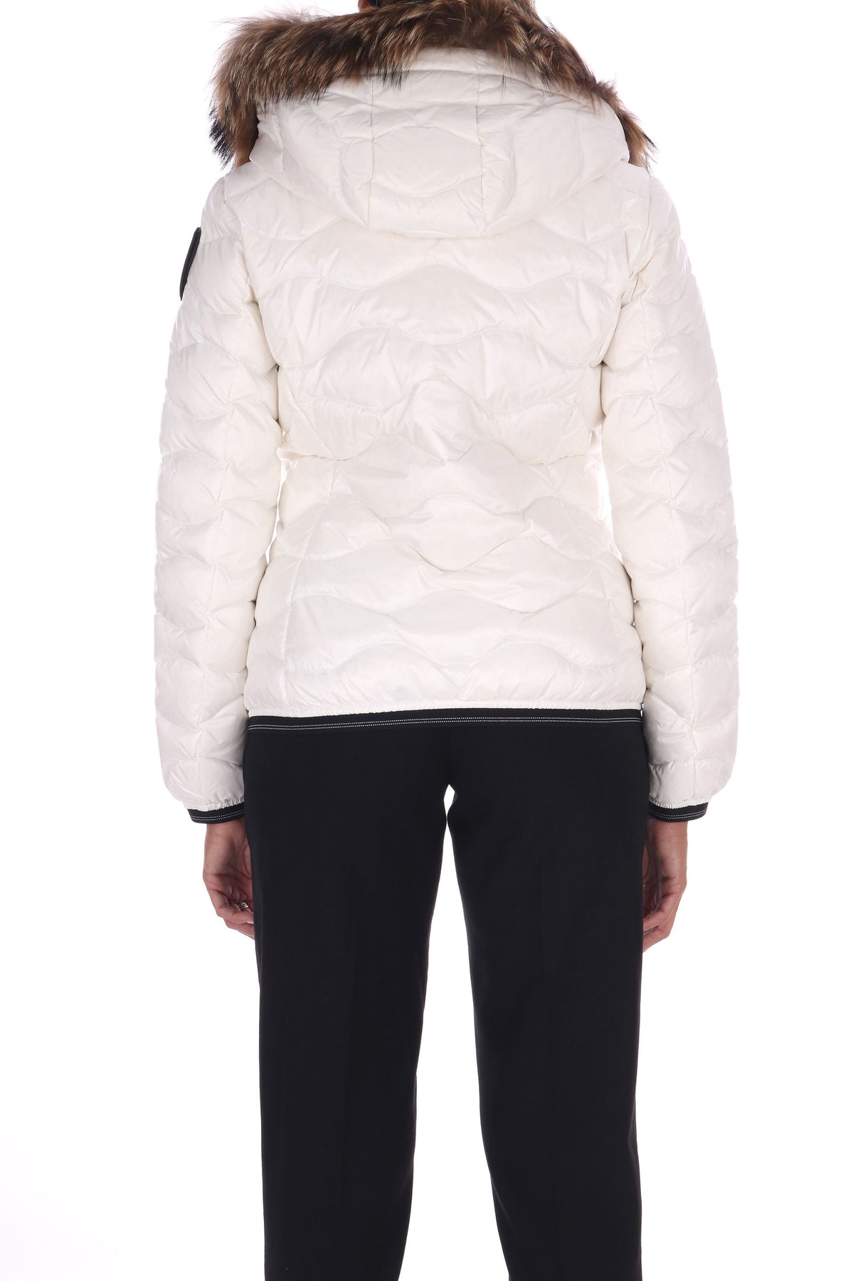 Piumino in nylon lucido con cappuccio fisso combina eleganza e funzionalità. L’imbottitura in piuma 90/10 da 175 grammi garantisce calore senza rinunciare alla leggerezza, mentre il bordo in vera pelliccia removibile aggiunge un tocco di raffinatezza personalizzabile. La fodera a contrasto colore valorizza il design e la chiusura con zip nascosta con copri cursore sul collo assicura una vestibilità protetta e pulita. Gli elastici rigati sul fondo e sui polsini migliorano la vestibilità, mentre le tasche con zip esterne e la tasca interna con velcro offrono praticità. Completa il look il patch con glitter e il passante con logo per un dettaglio distintivo.